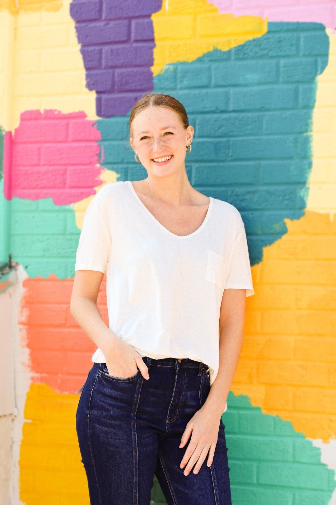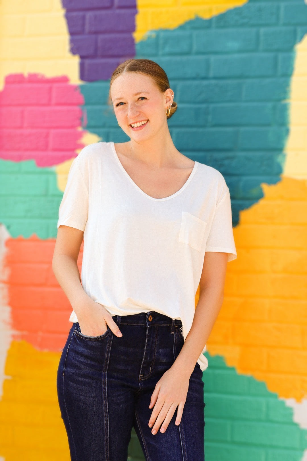 Basic top with pocket on top left front with low shoulder seam line. Super-soft and lightweight fabric.