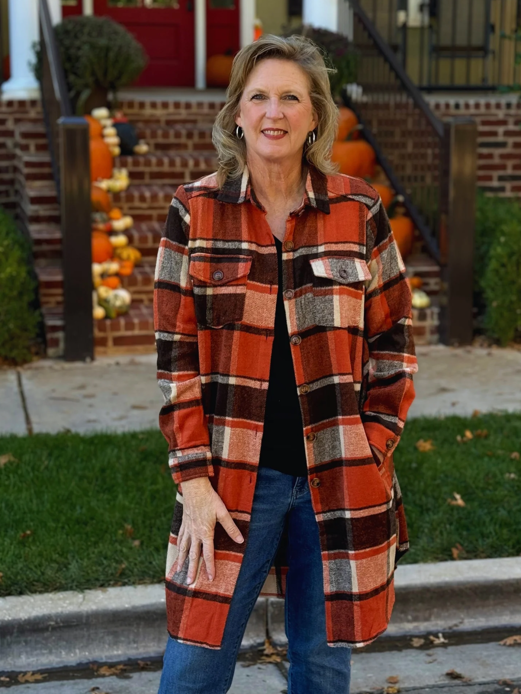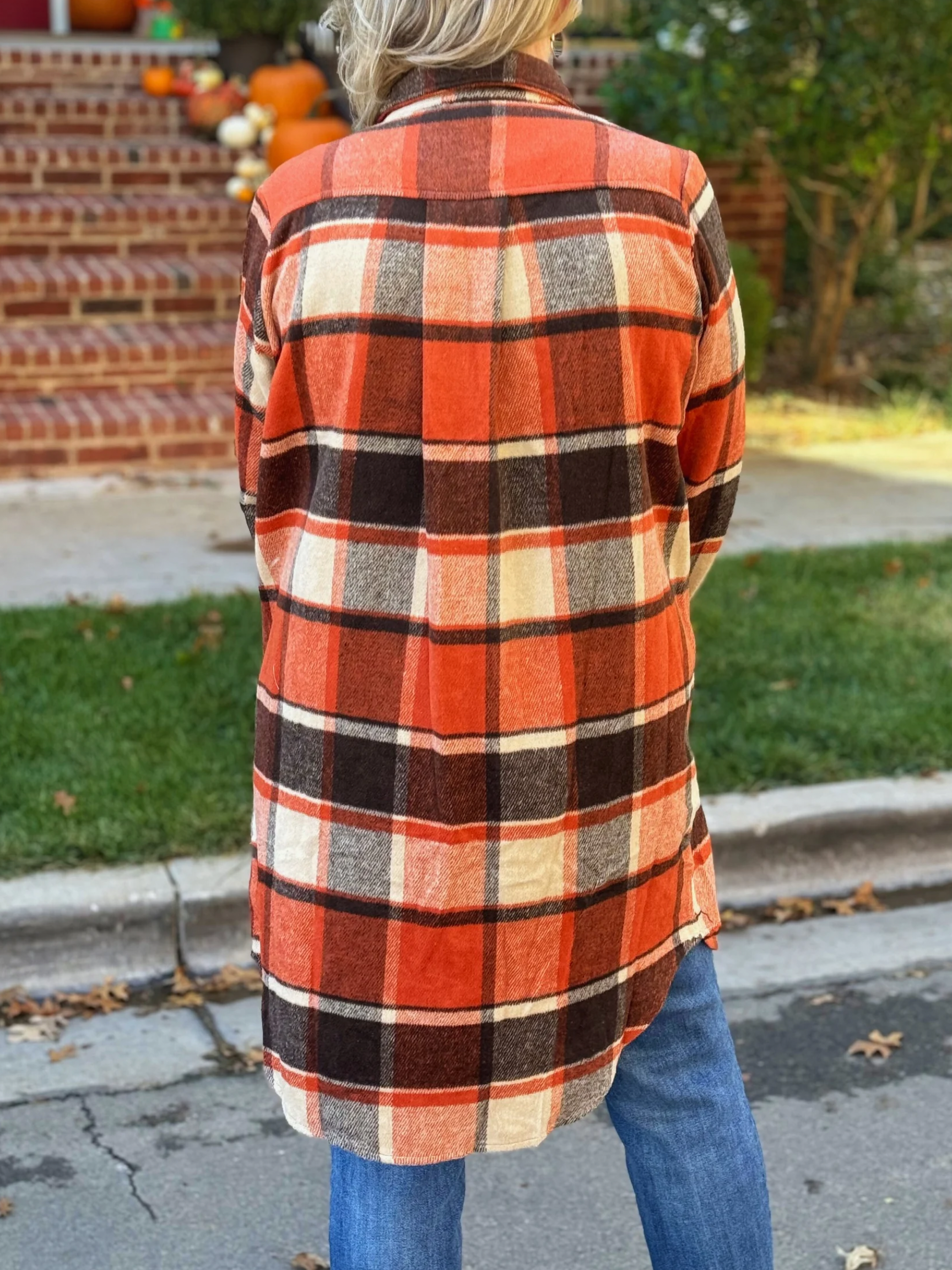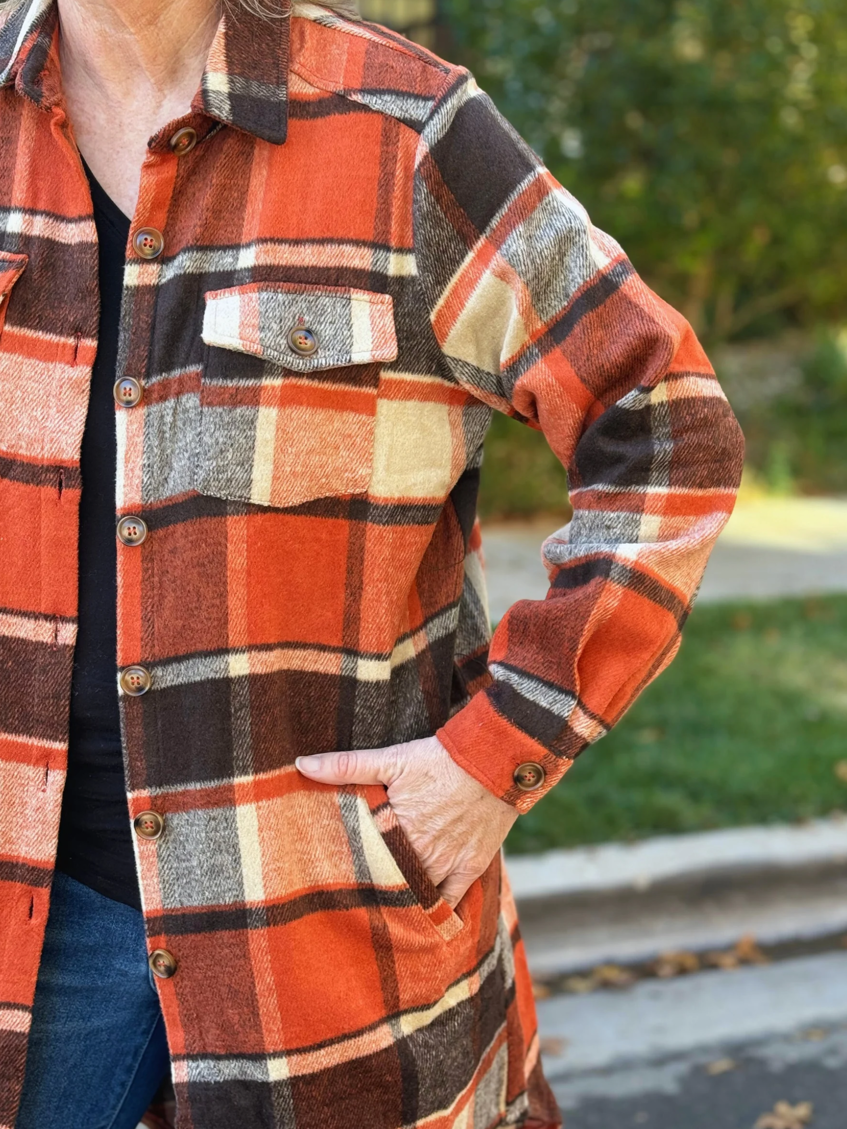 Flannel plaid top featuring a button-down front, long sleeves, longline length, and two chest pockets & side pockets. Wear it alone as a cozy plaid shirt or layer over your favorite top as a cute jacket.