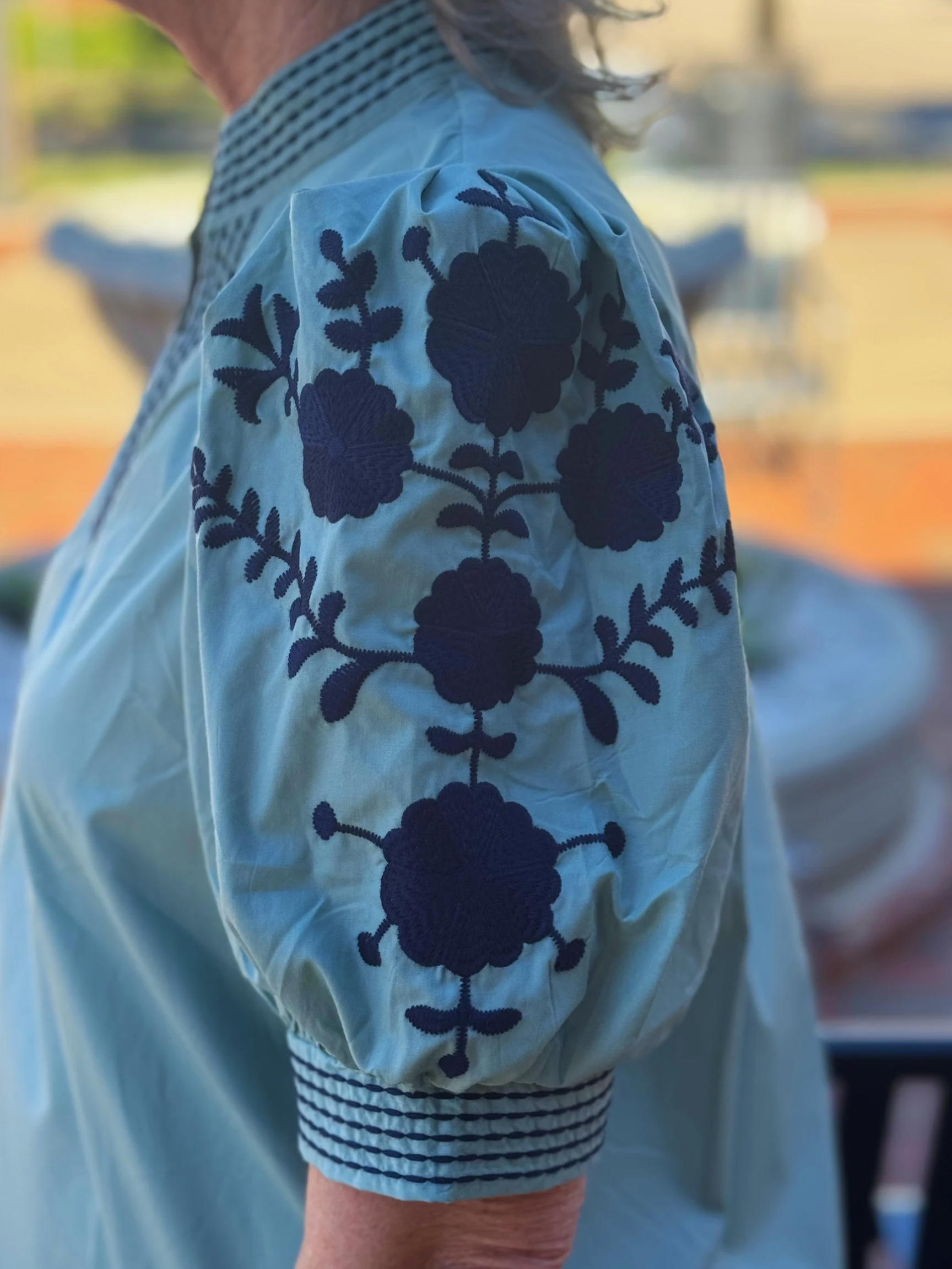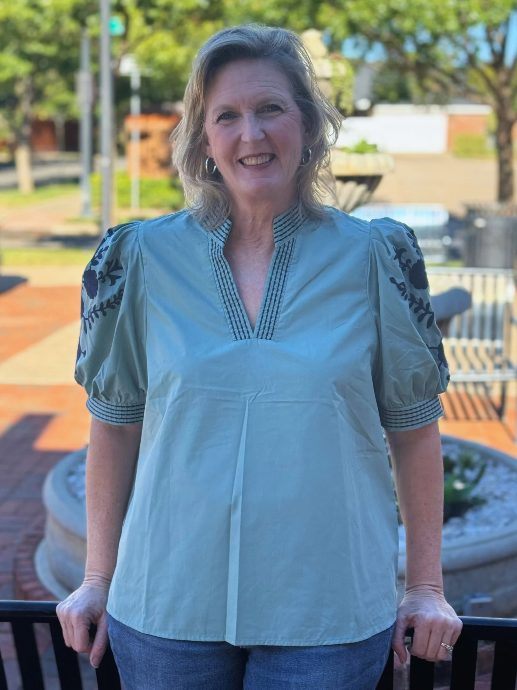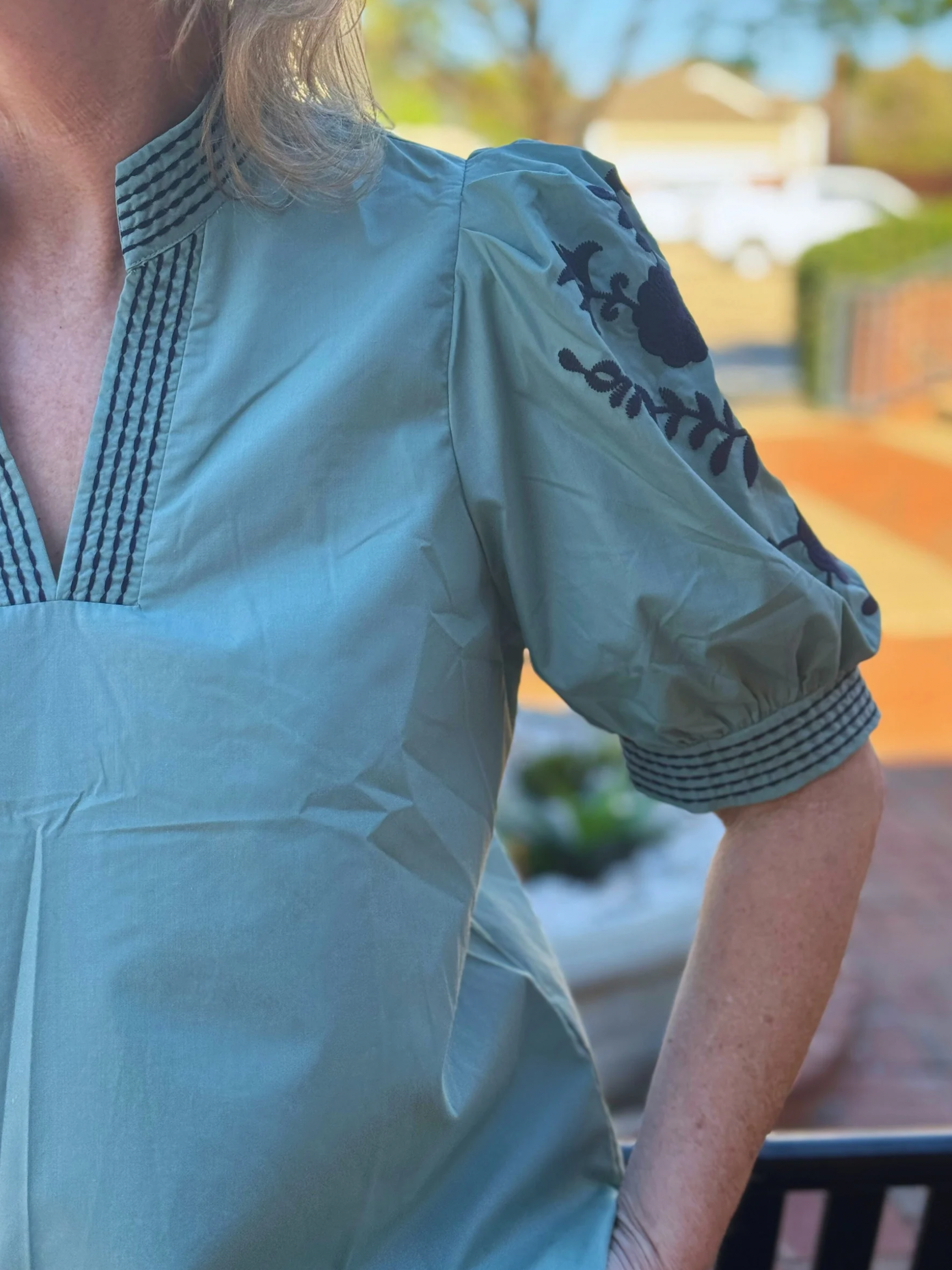 Solid short puff sleeve top featuring embroidered sleeve and band accent detail. Unlined. Woven. Non-sheer. Lightweight.
