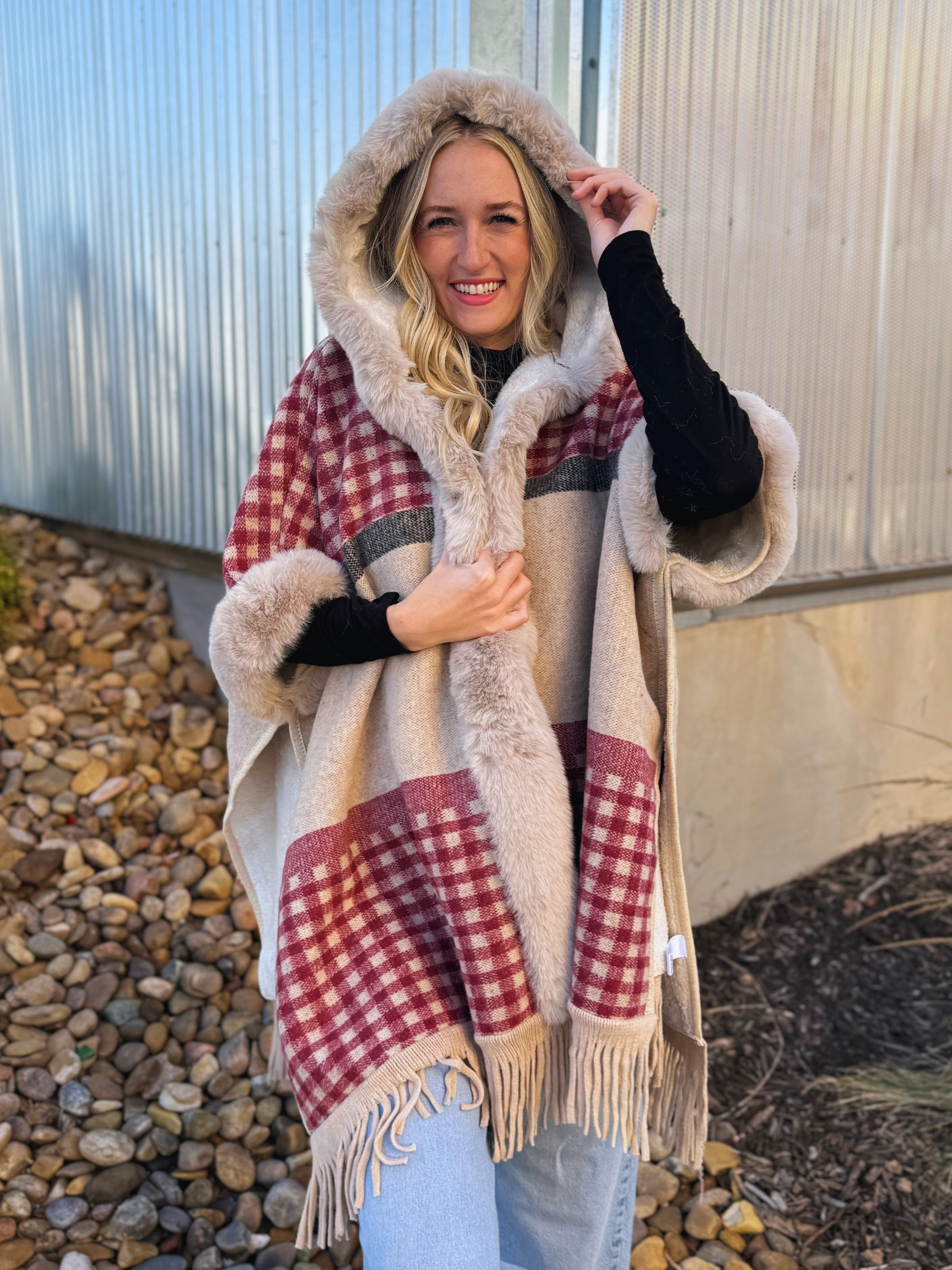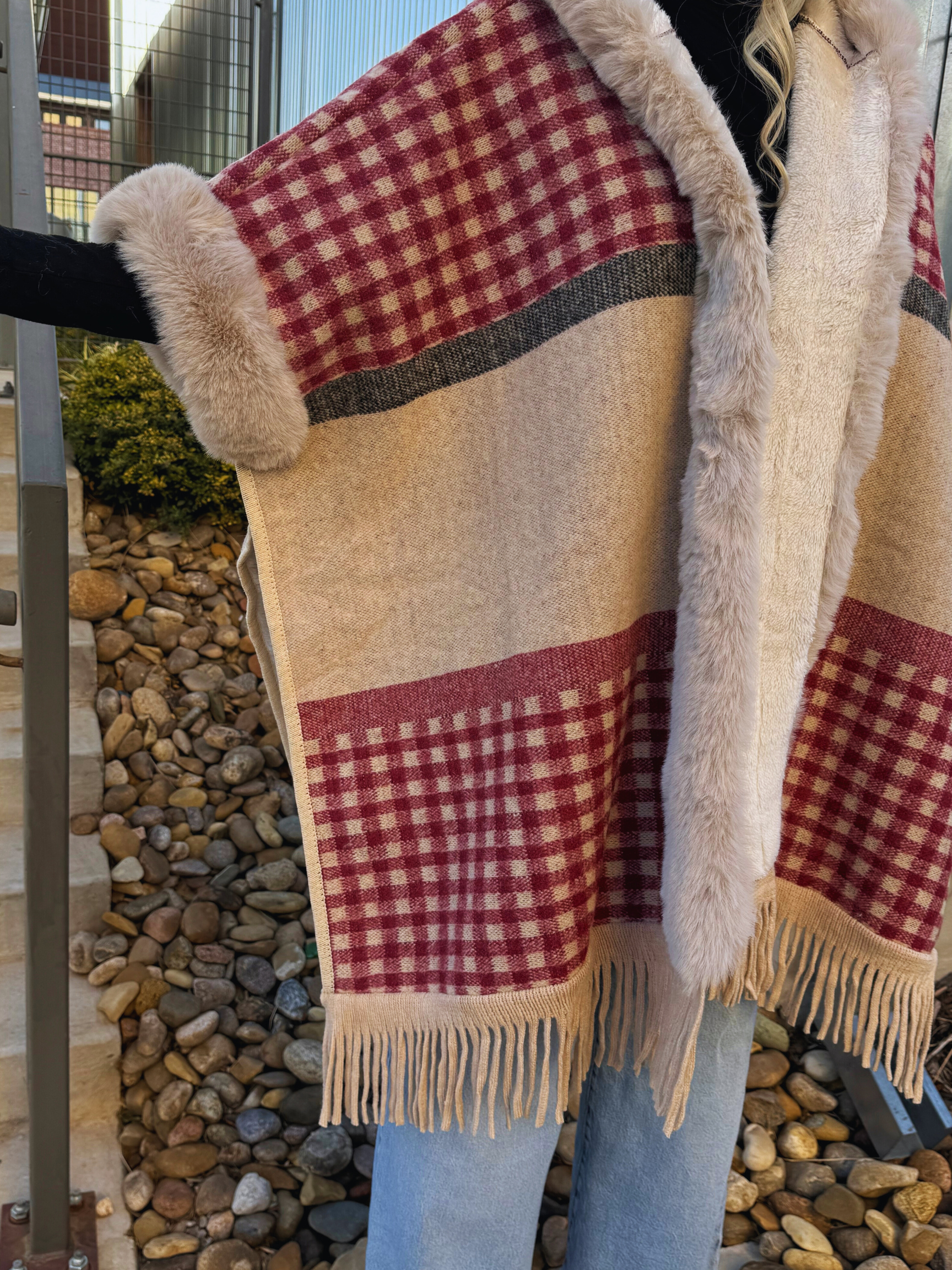 Oversized Cape With Faux Fur Trim And Fringed Hem