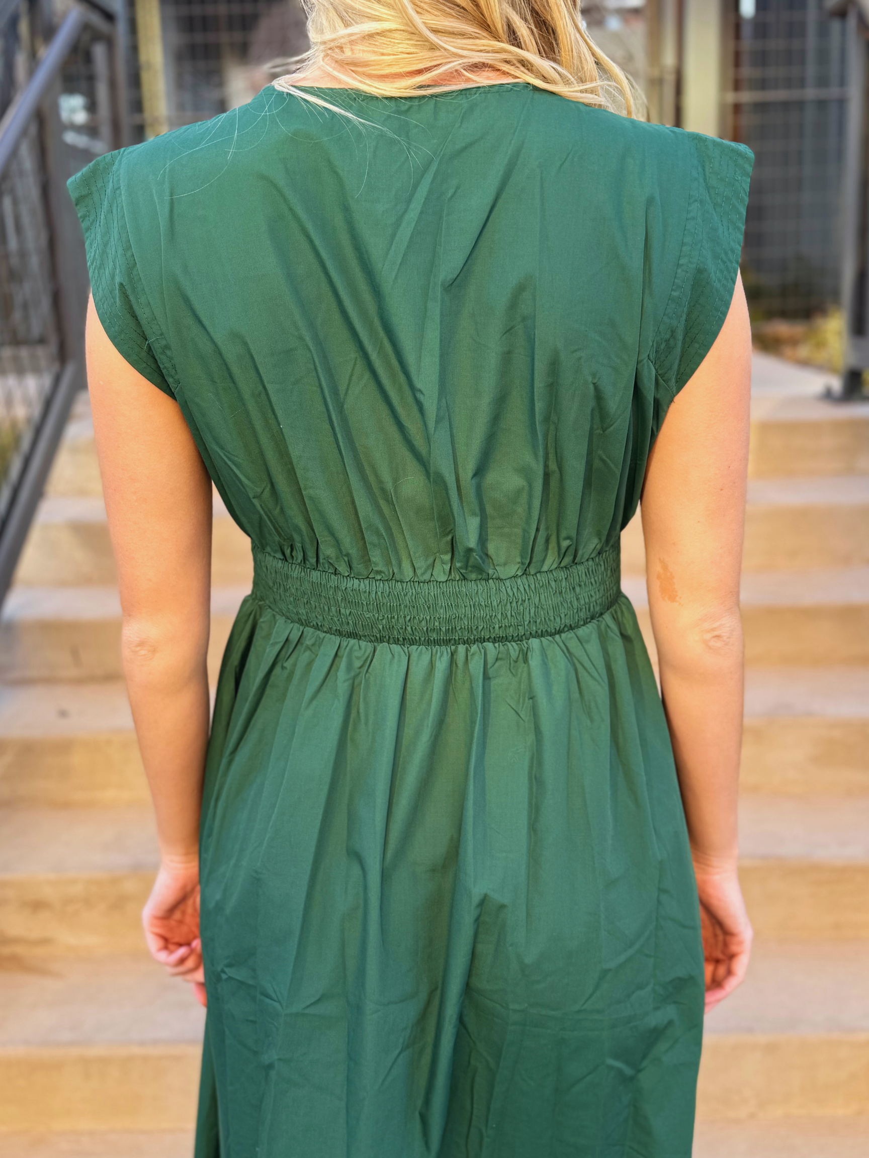 Solid V-neck zip-front cap sleeve midi dress featuring textured stitching bands. Smocked waistband at back. Side pockets. Lined. Woven. Non-sheer. Lightweight.