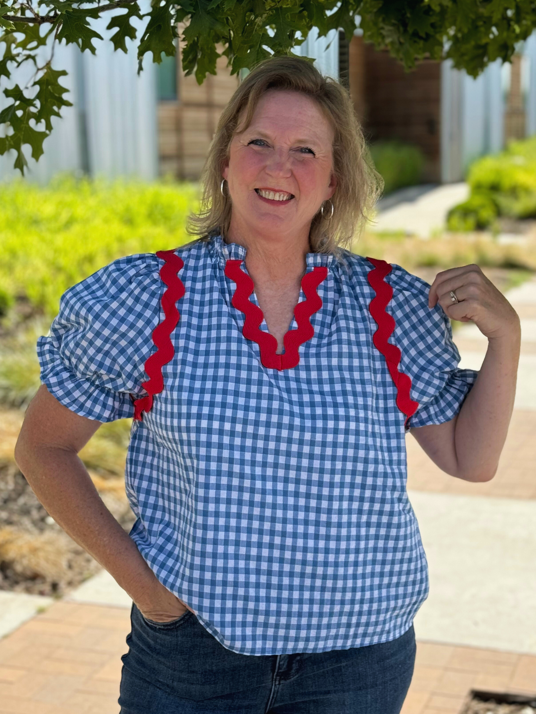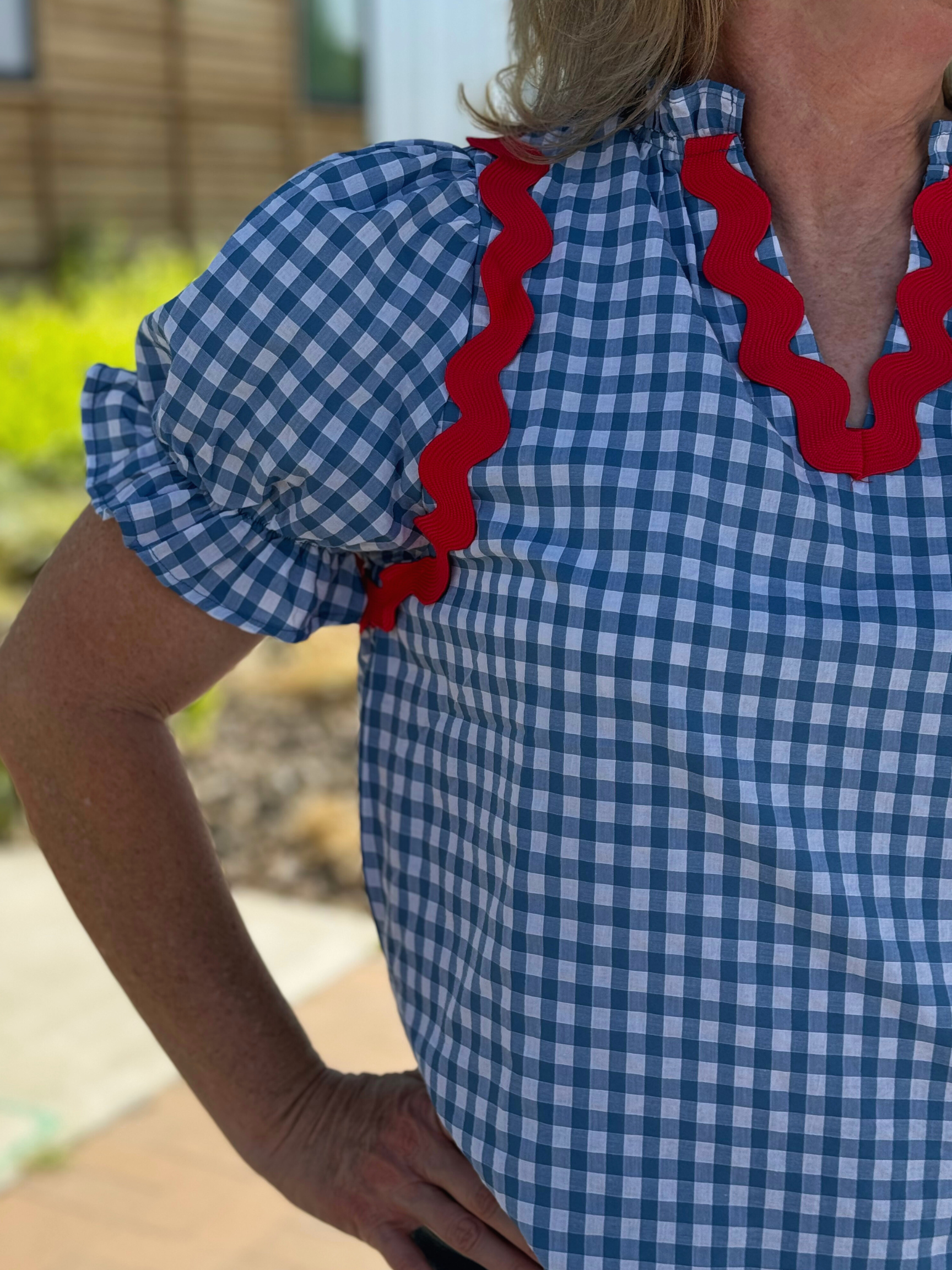 Ric-Rac Trimmed Gingham Check Puff Sleeve Blouse