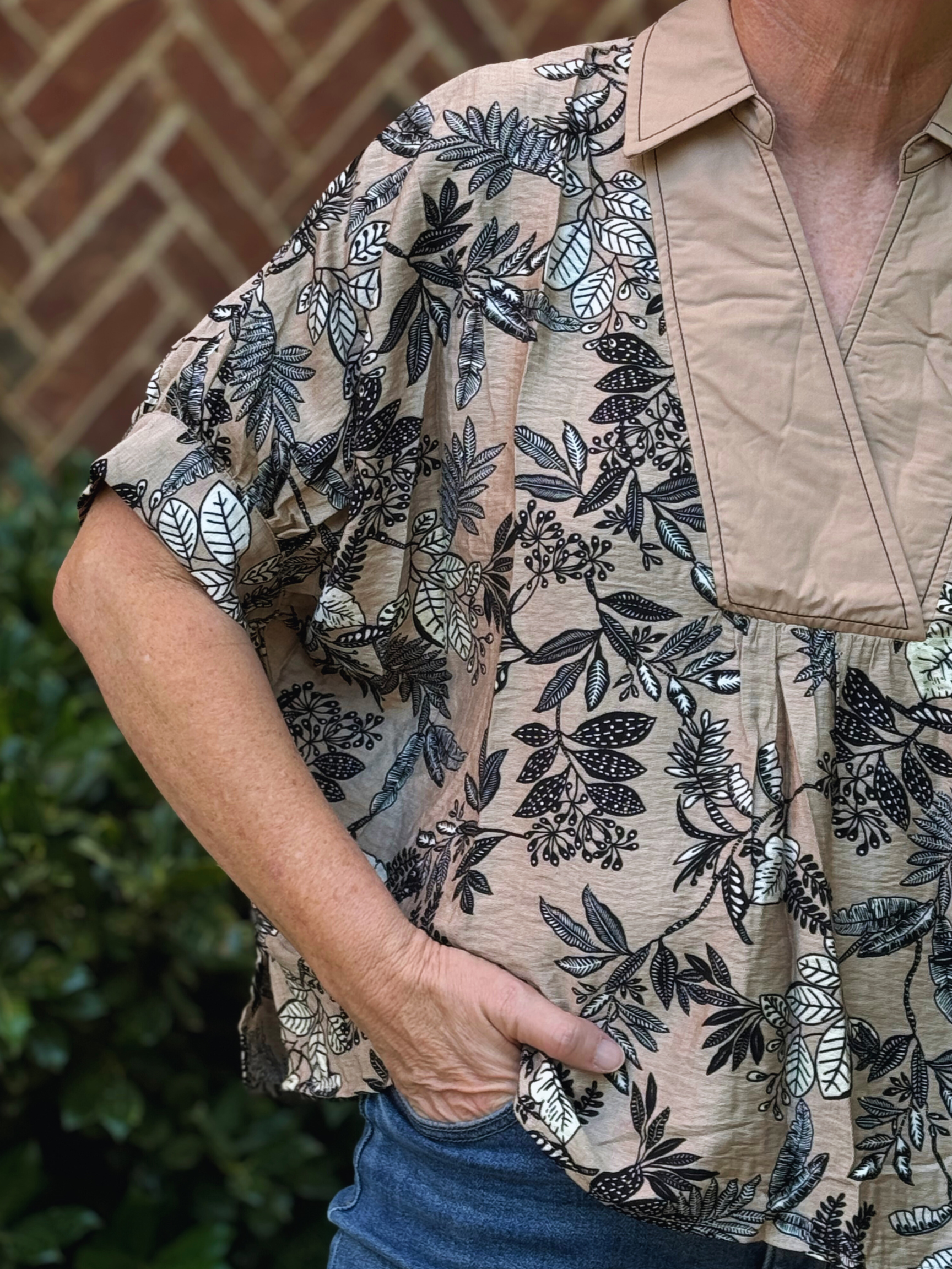 Botanical print short dolman sleeve top featuring contrast accent surplice neck detailing. Unlined. Woven. Non-sheer. Lightweight.