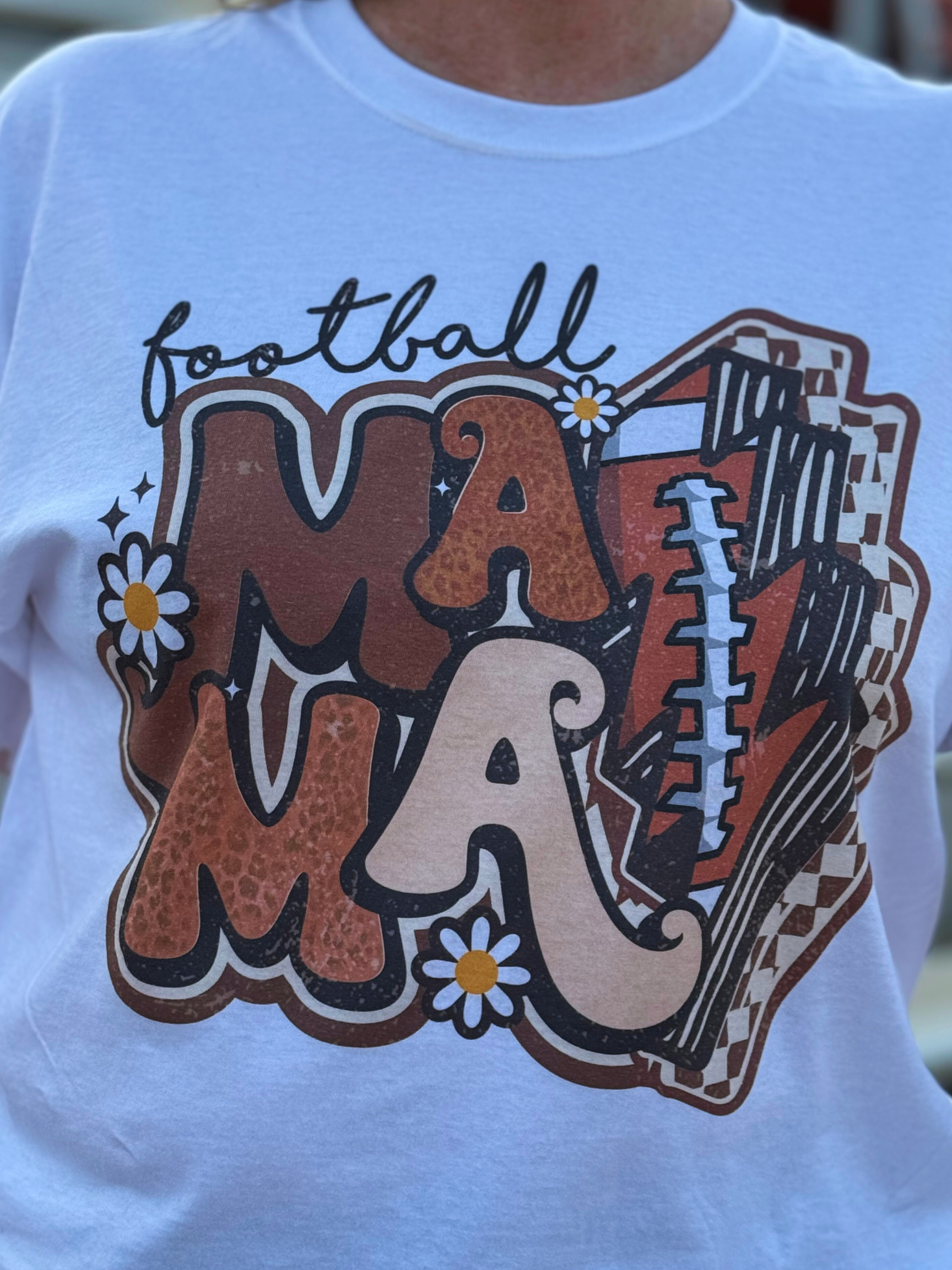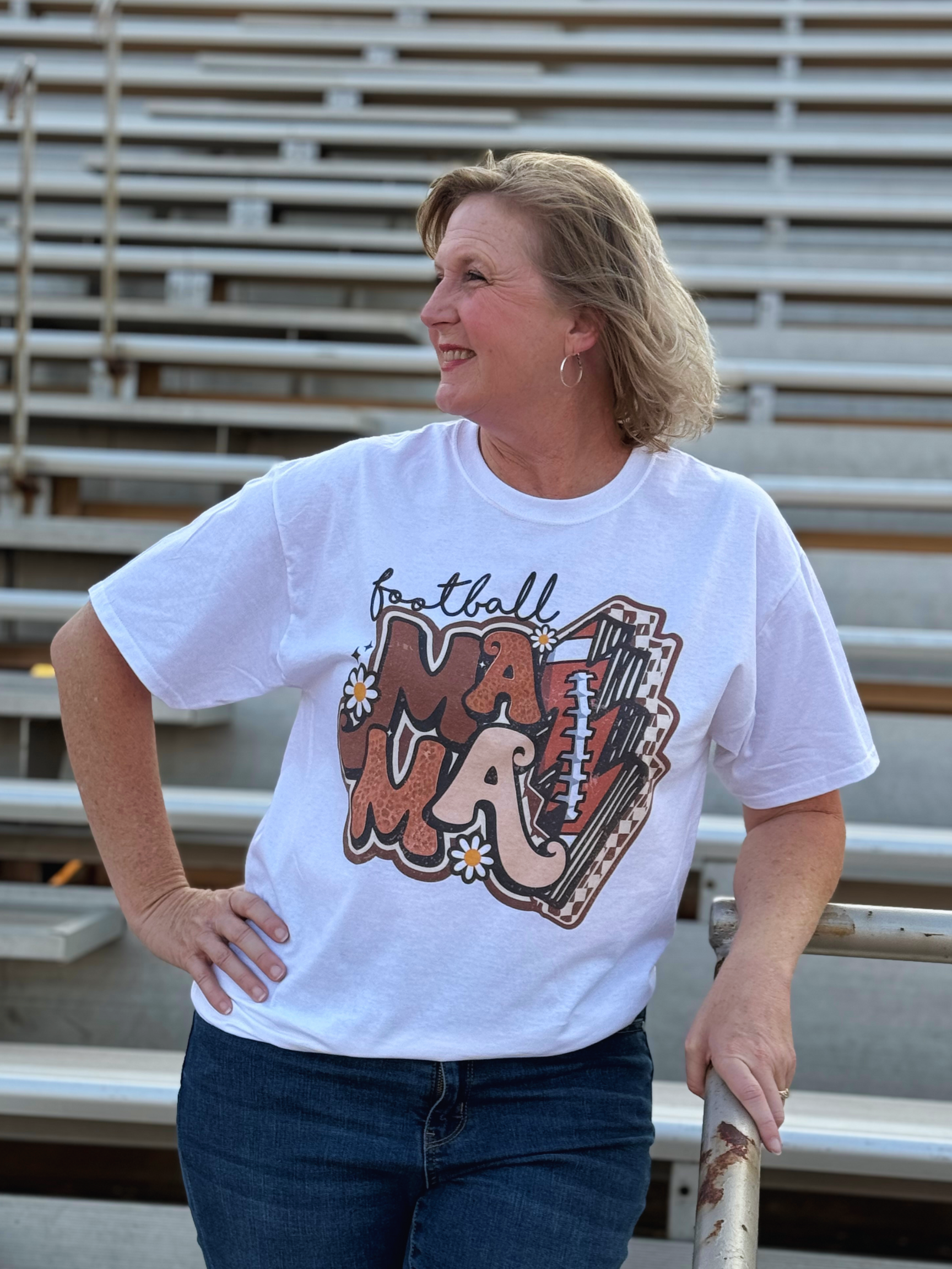 This graphic t-shirt has a distressed design that features multi-brown shade MAMA with a football lightning bolt with small white flowers throughout the design. This top is perfect for every game day!