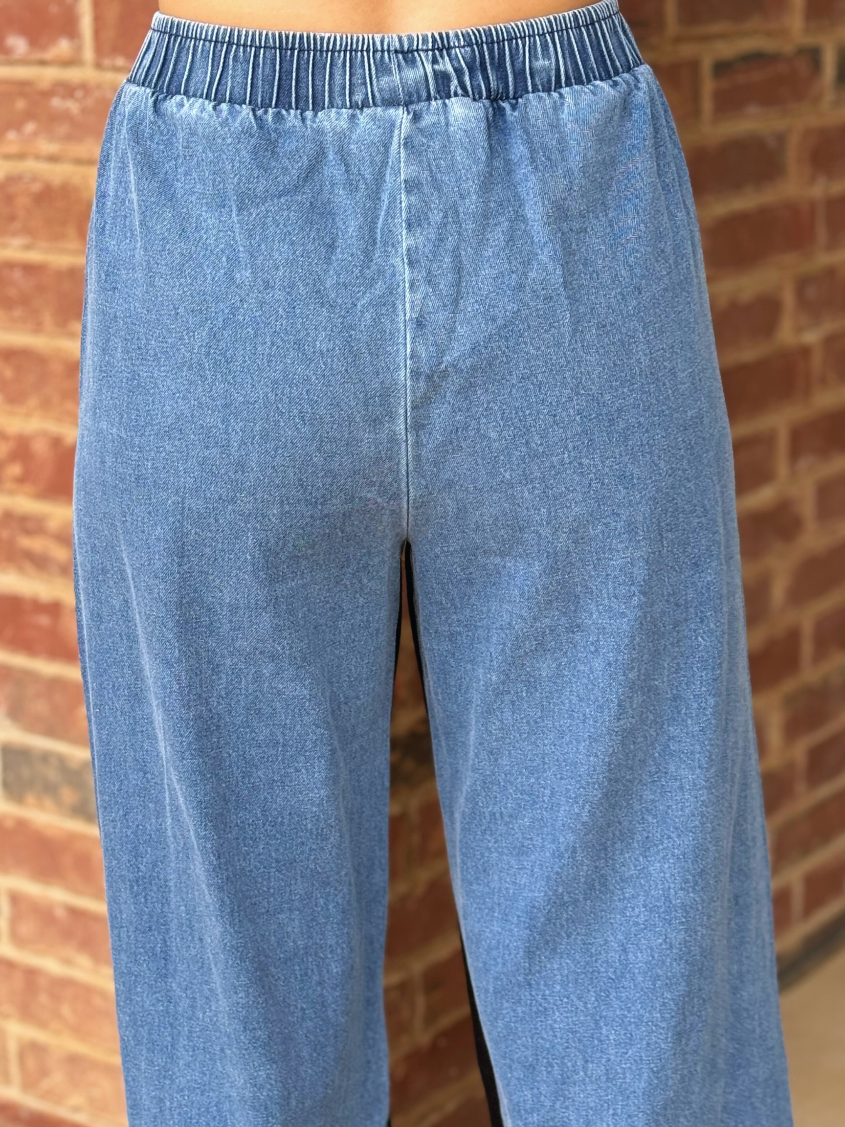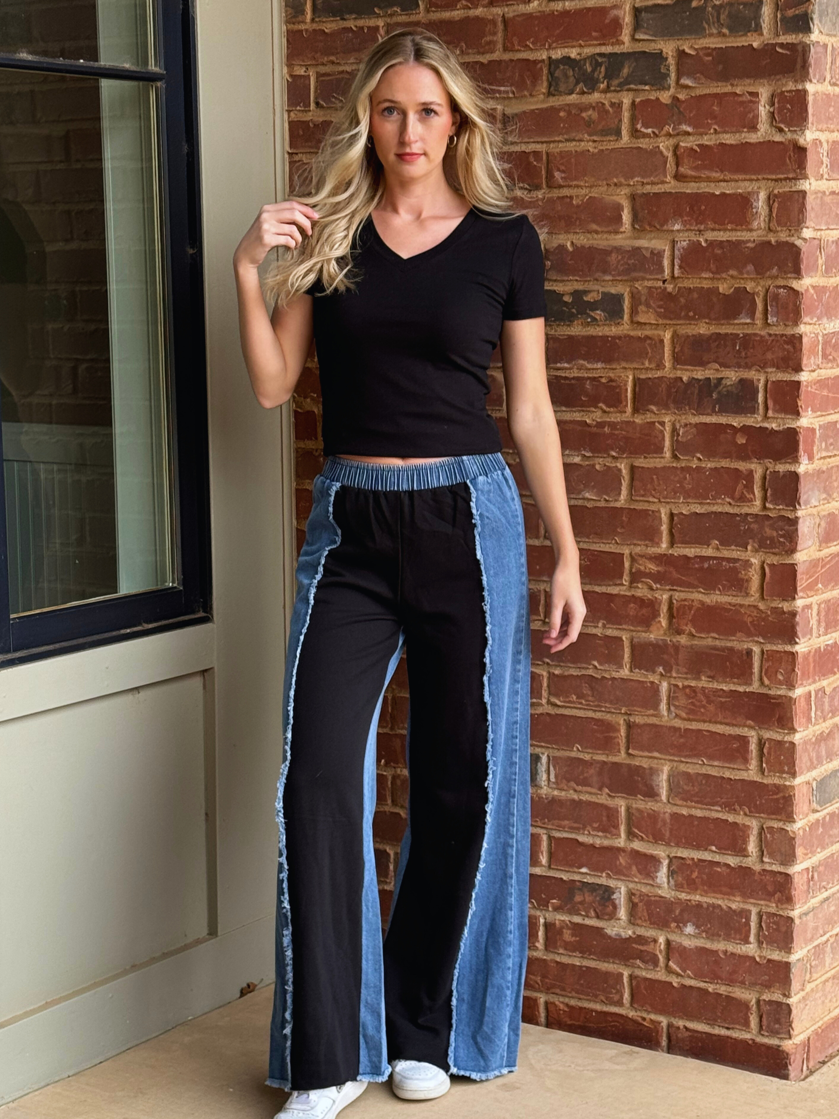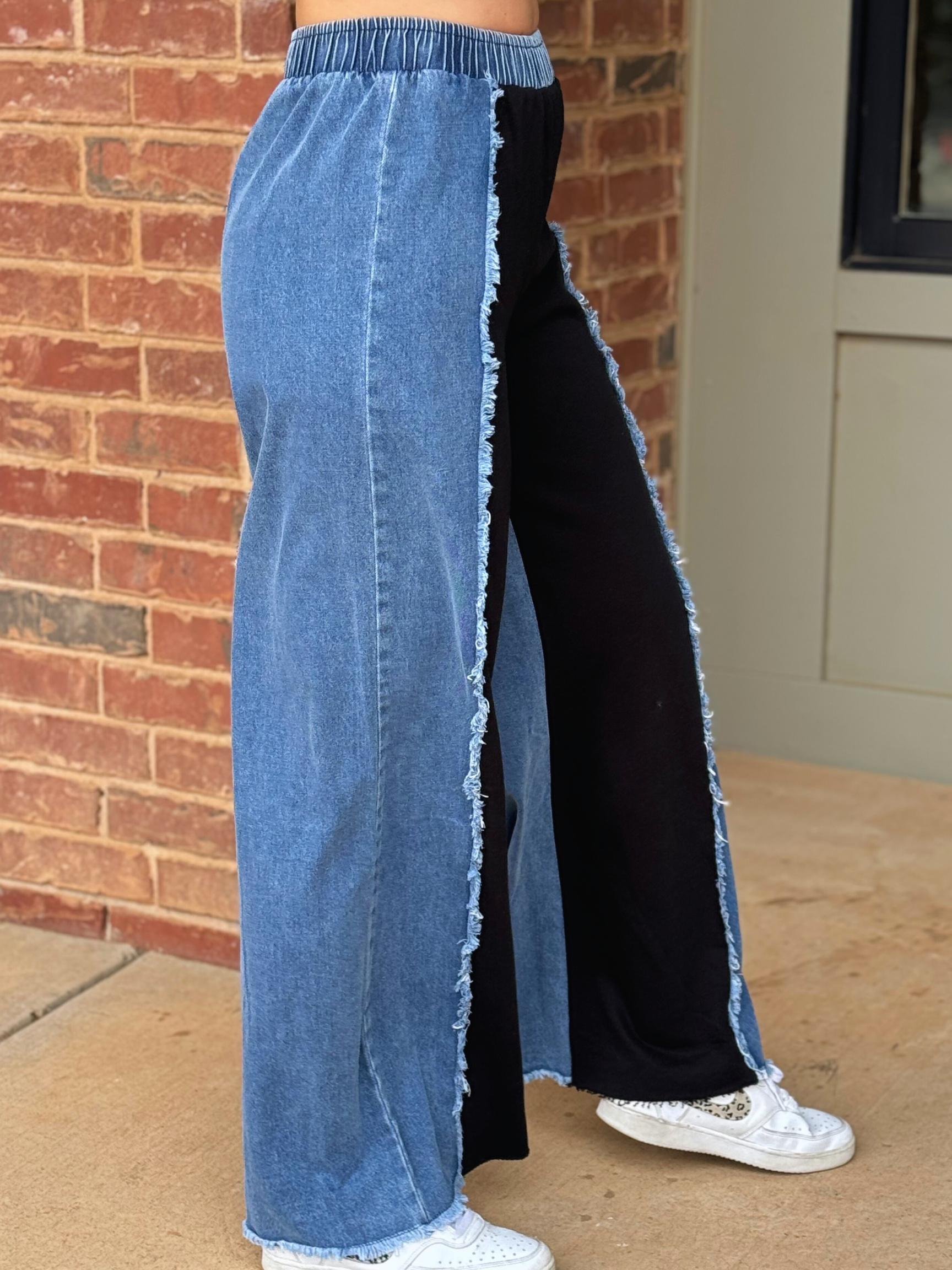 Distressed Denim Terry Block Wide Leg Pants with Elasticized Waist