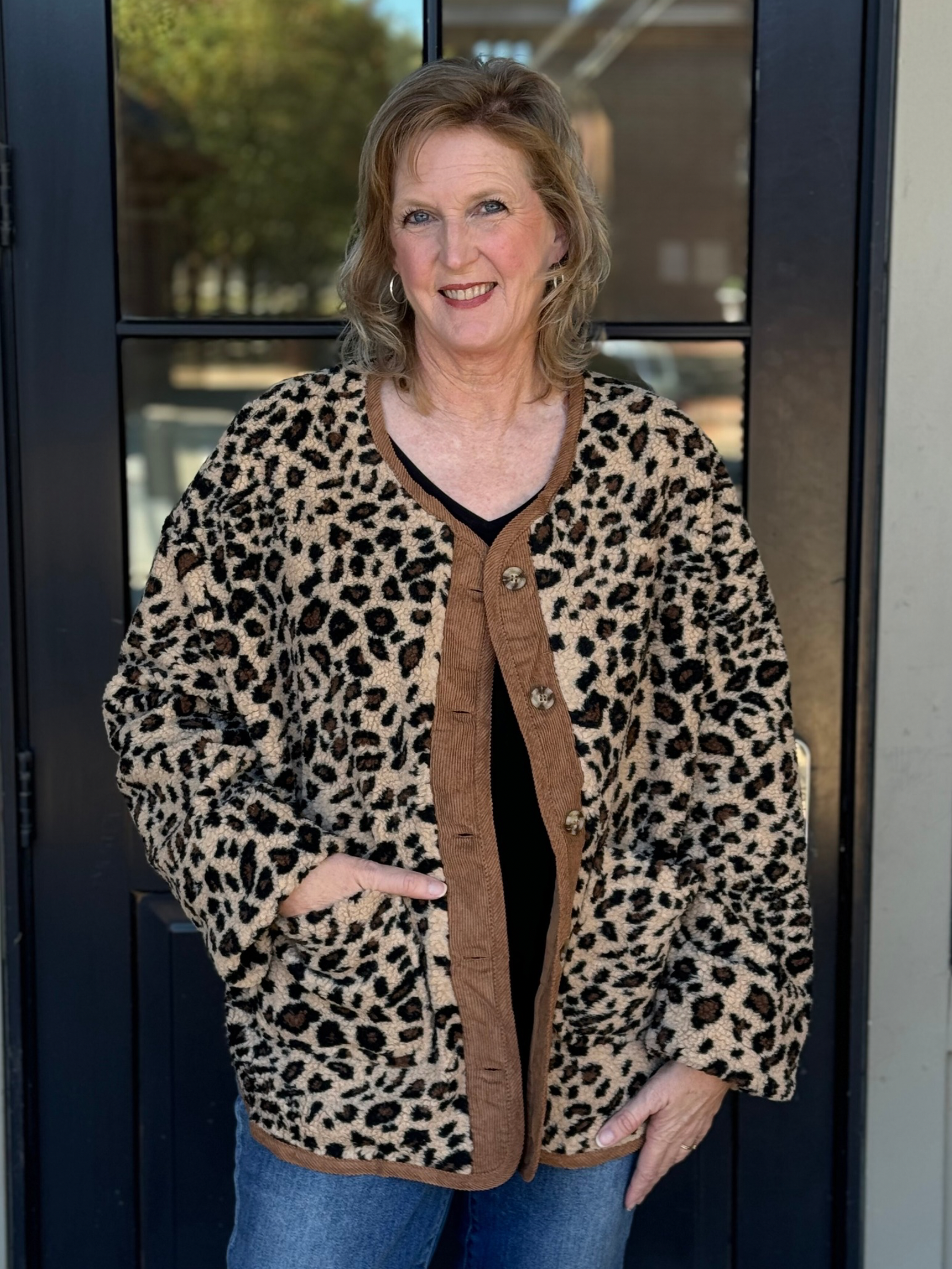 Embrace the coziness with this Leopard Sherpa Jacket, featuring a timeless leopard print and a structured button front. Ideal for casual outings or chic layering, it promises style and comfort. Pair with sleek denim or black leggings for an effortlessly stylish look.