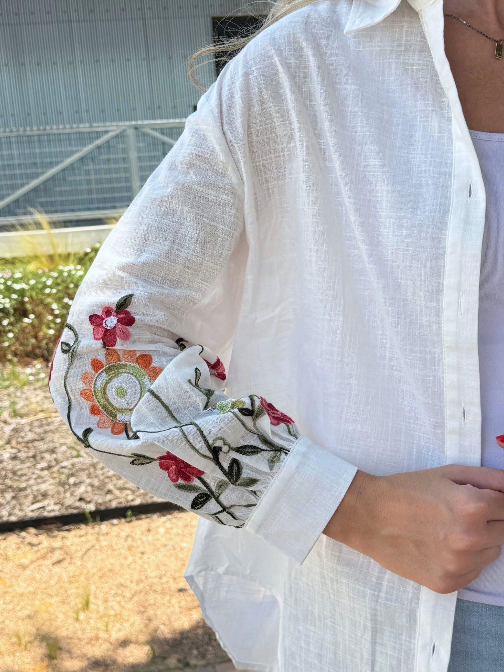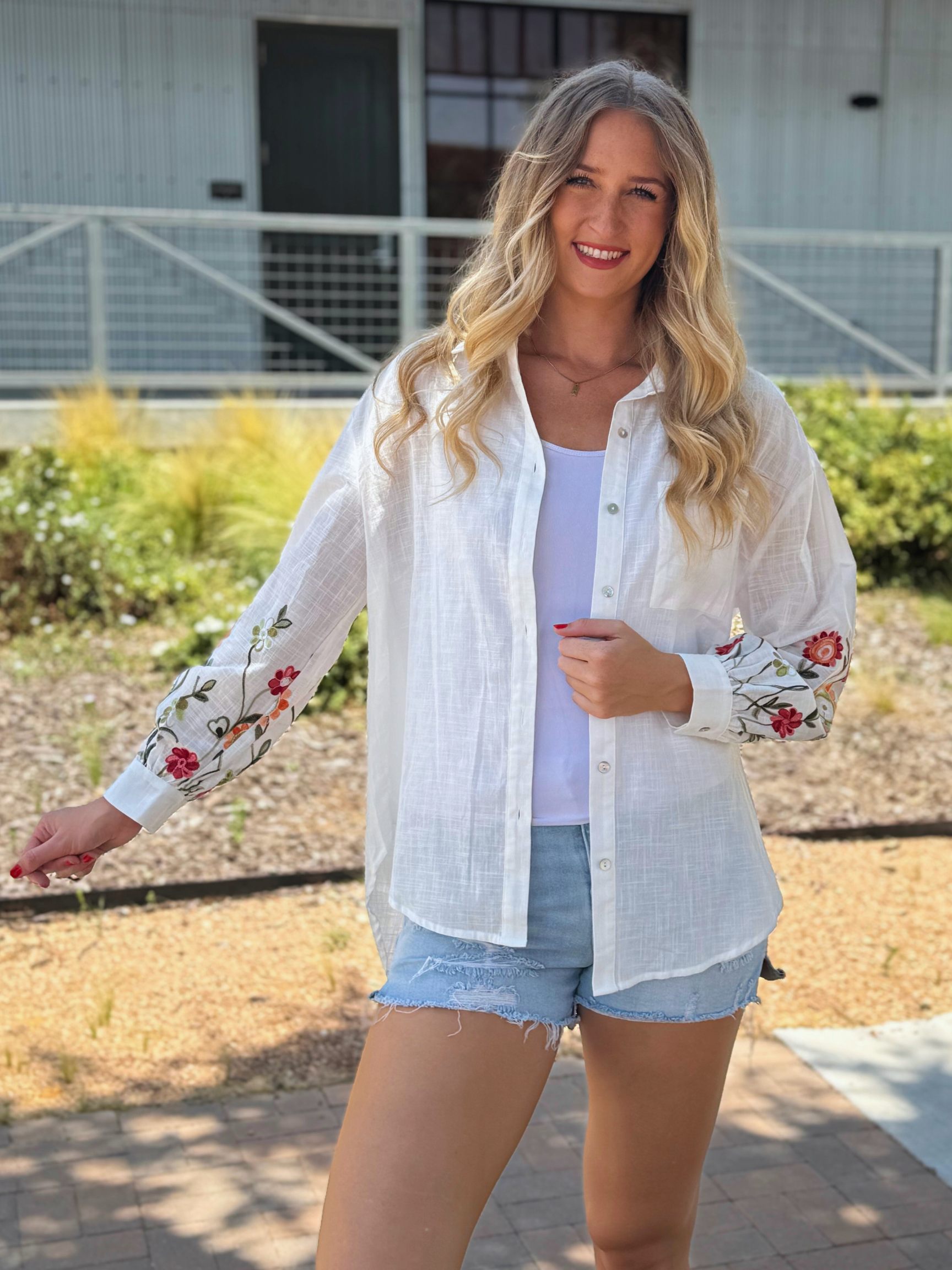 Embroidered Sleeve Button Down Loose Fit Shirt