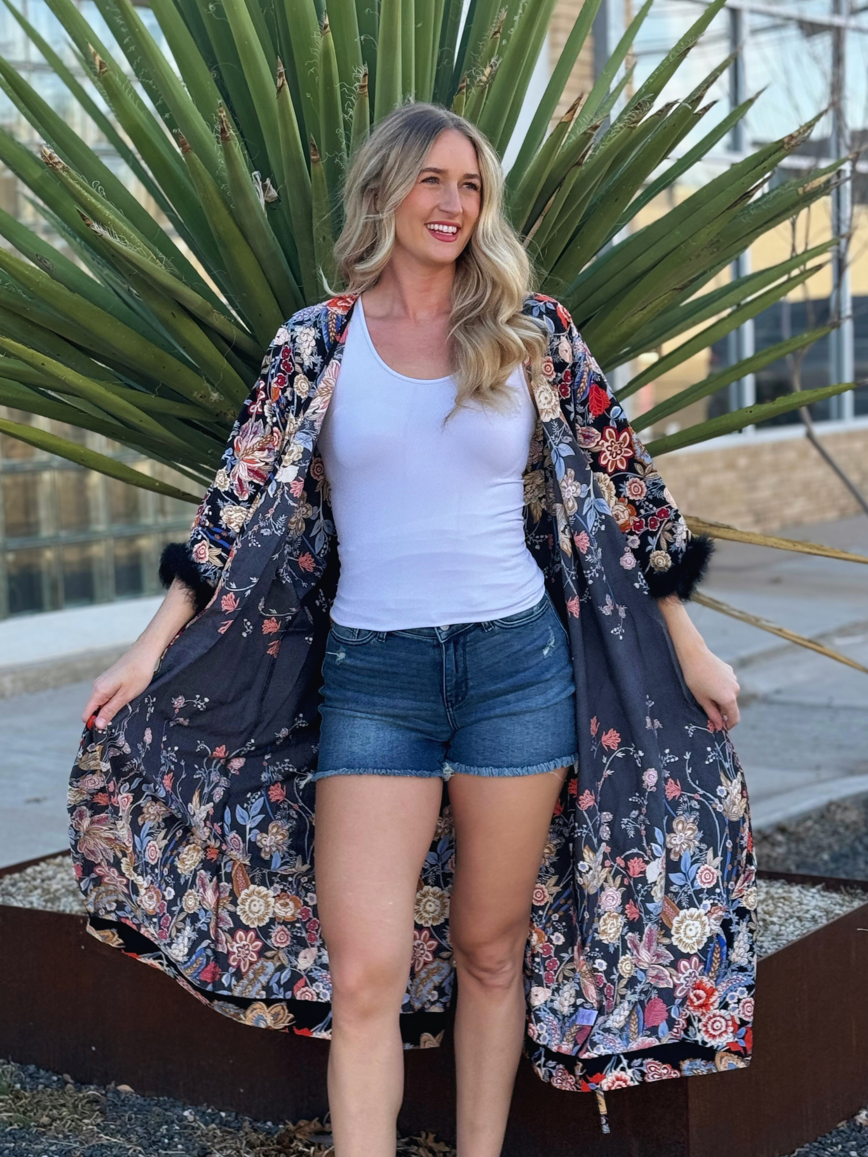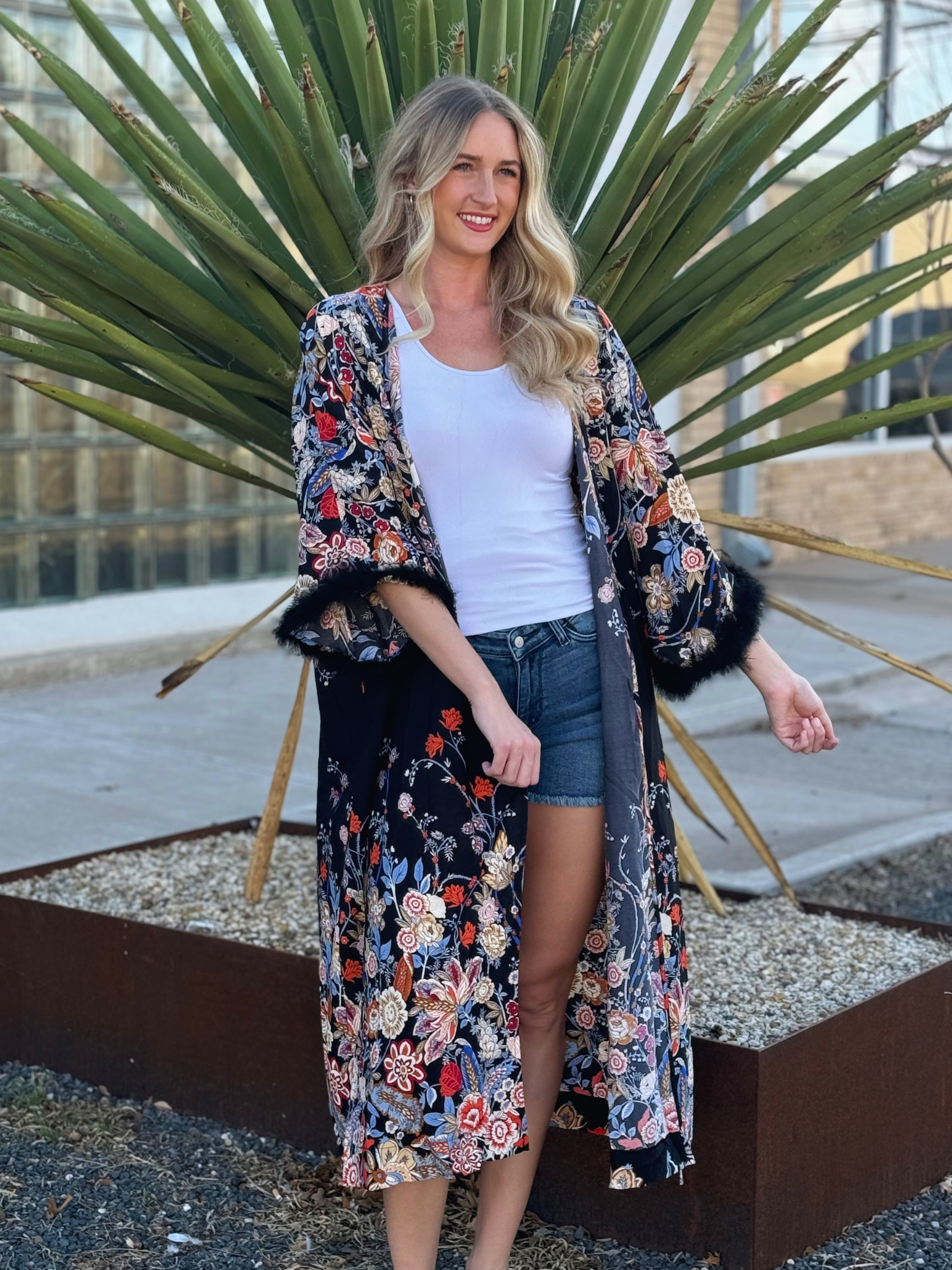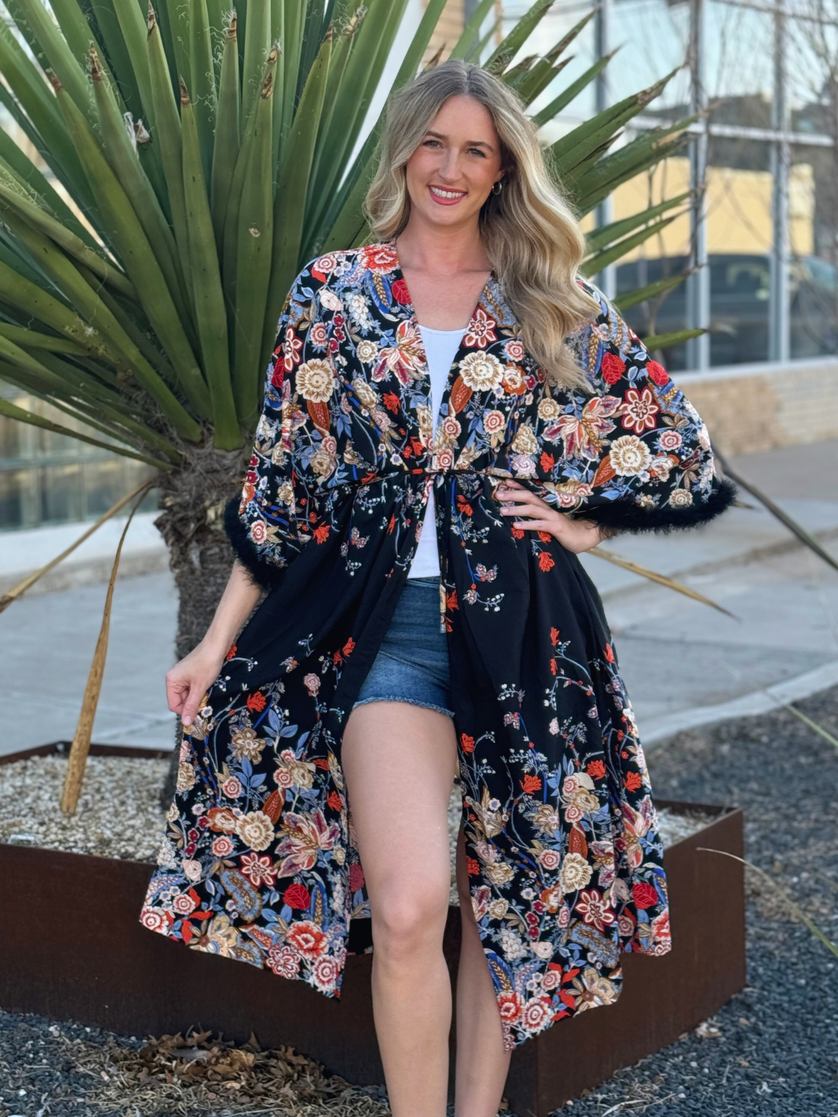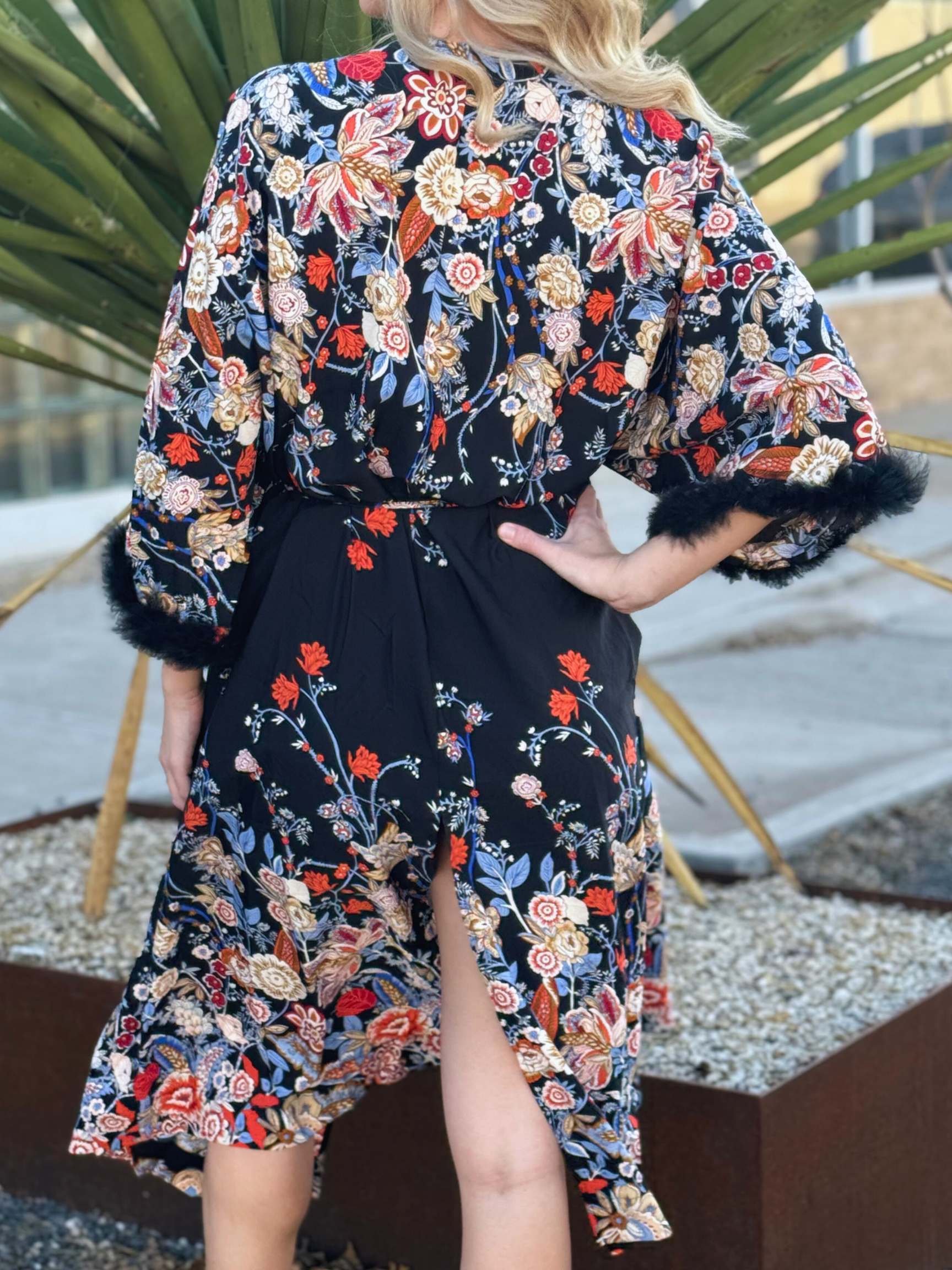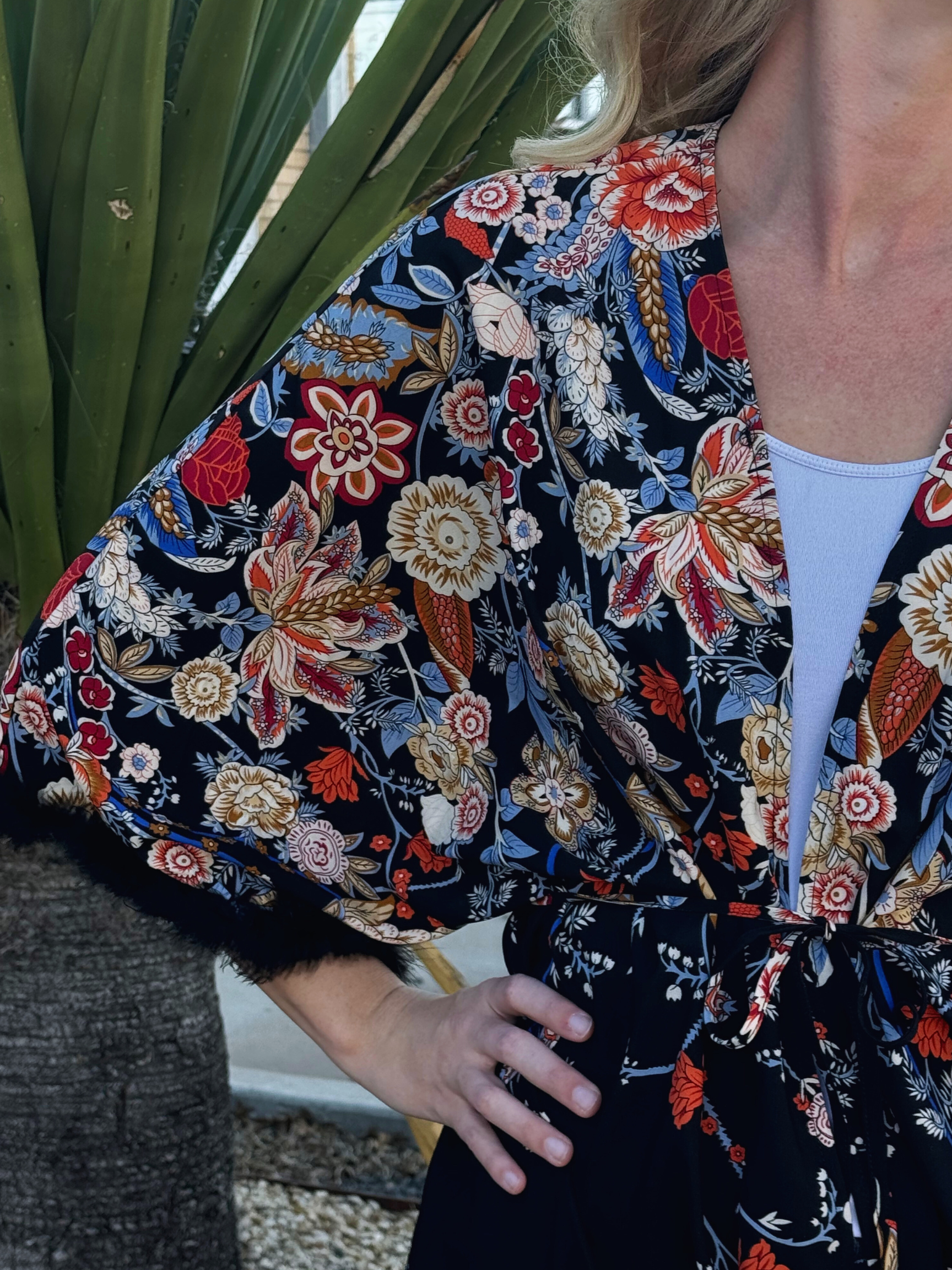 Bold Floral Print Kimono with Feather Detail at Cuffs