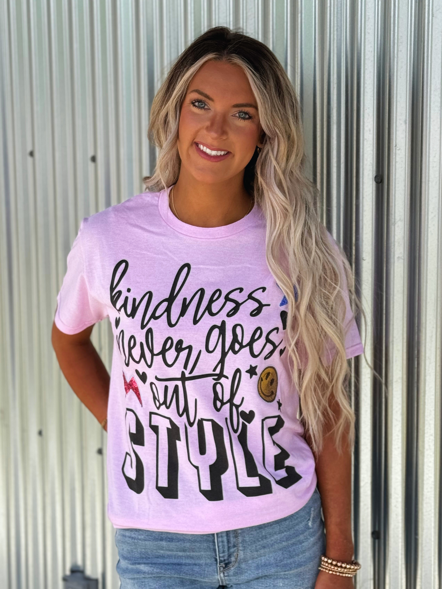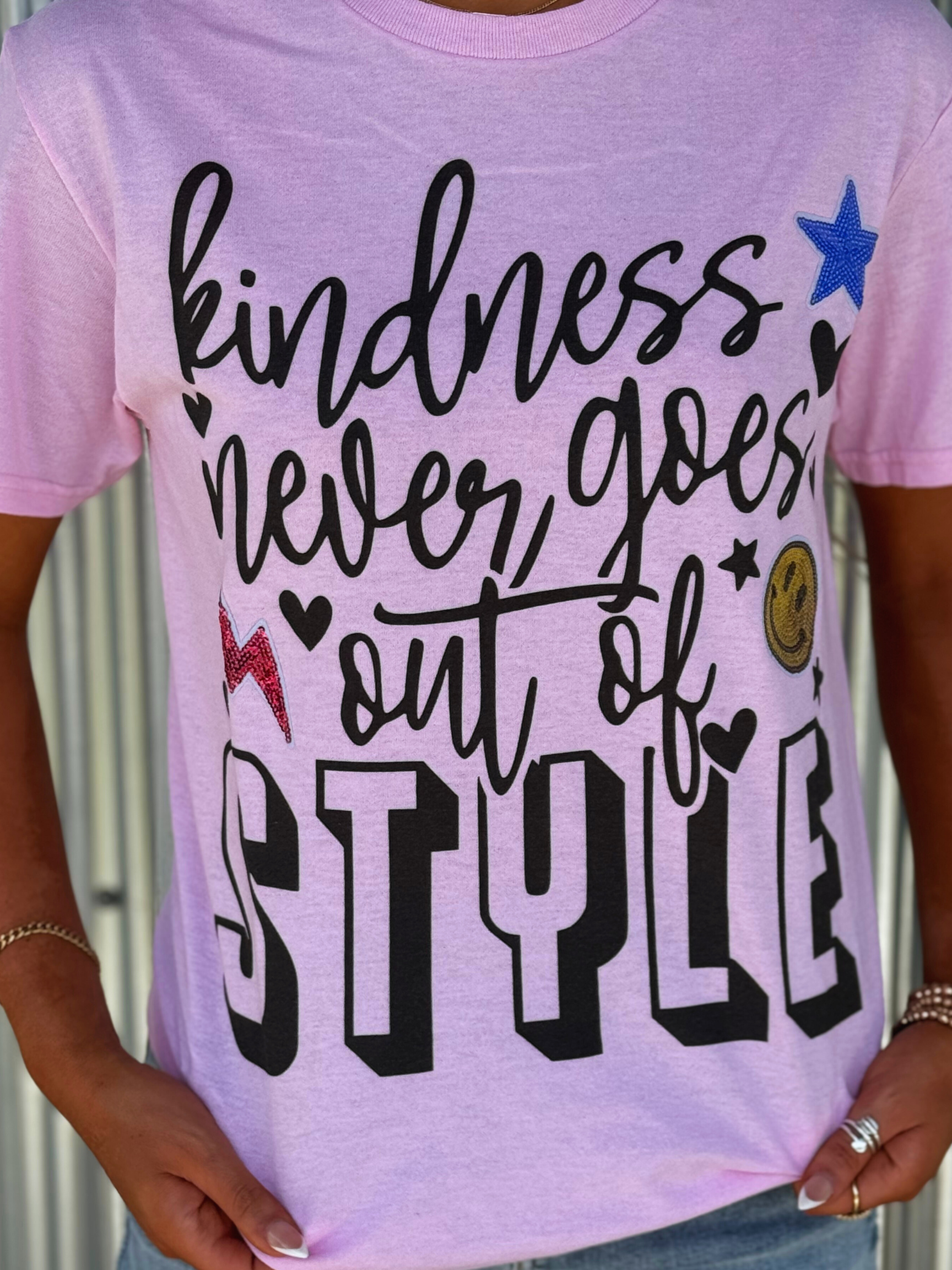 100% cotton graphic short sleeve light pink t-shirt. This design says, "Kindness Never Goes Out Of Style" with a script font allowing the word STYLE to stand out in a block font. This design has a variety of sequin patches including, a Star, Smiley Face, and Lightning Bolt to add the perfect sparkle.