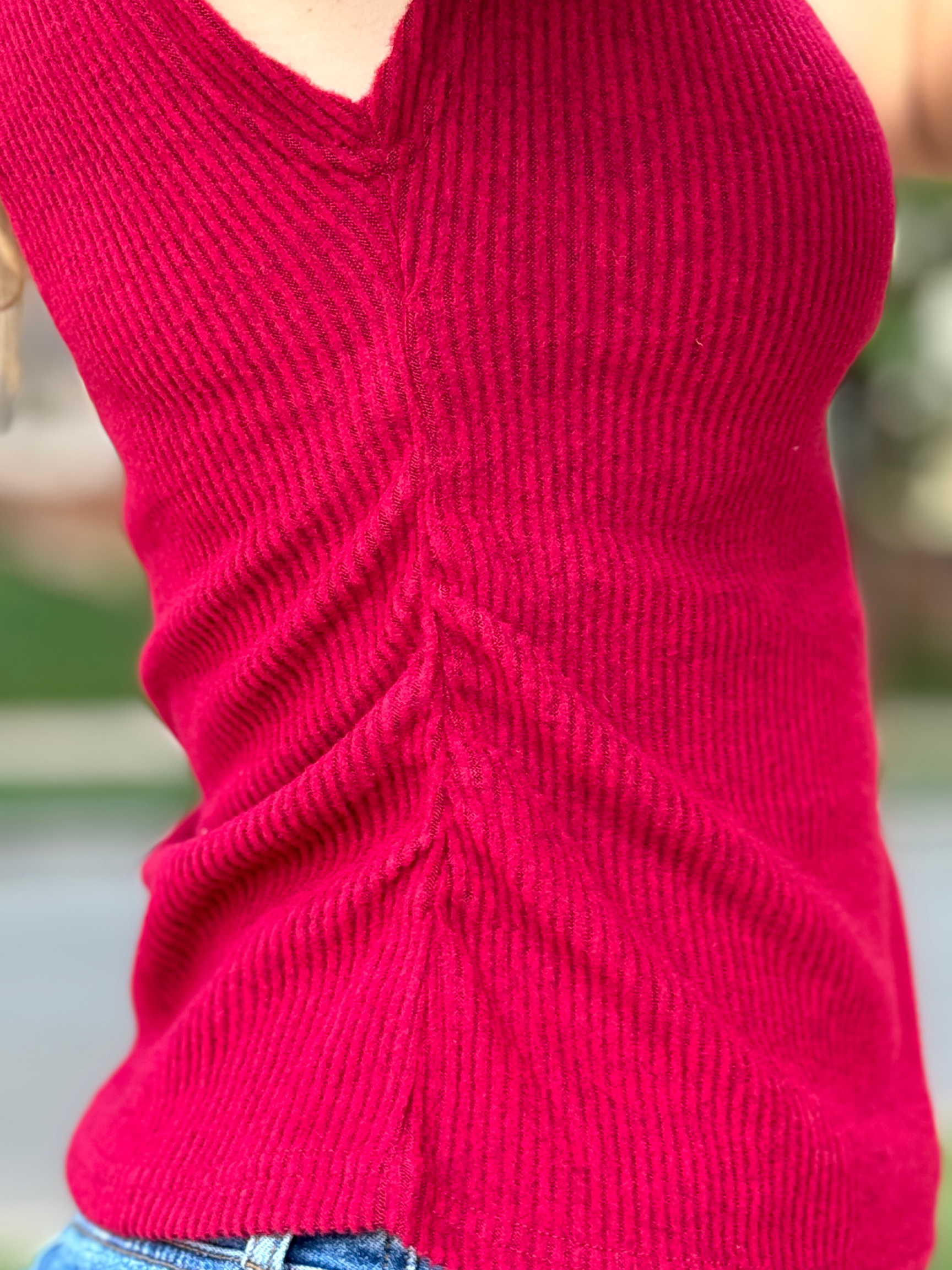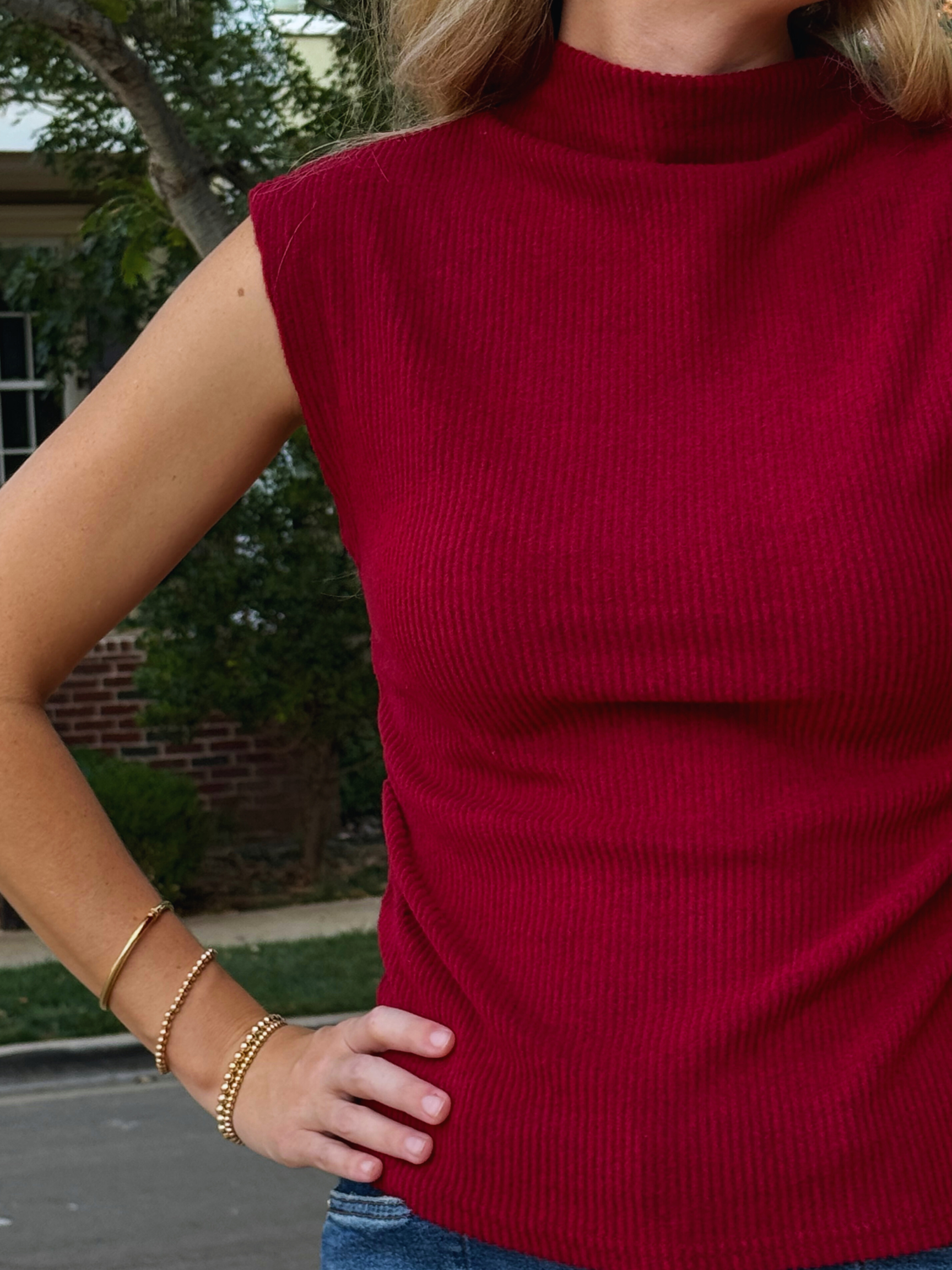 This ribbed knit top features a soft mock neckline, cap sleeves, and flattering side ruching that enhances the shape with a modern, textured finish.