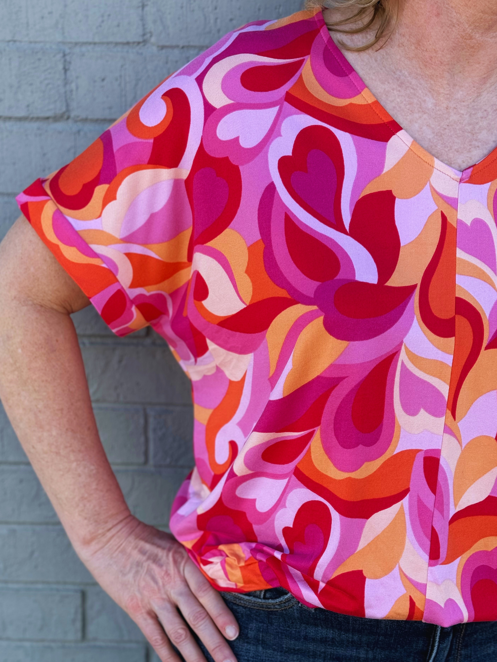 V neck drop shoulder loose fit dolman short sleeve banded geometric heart knot top