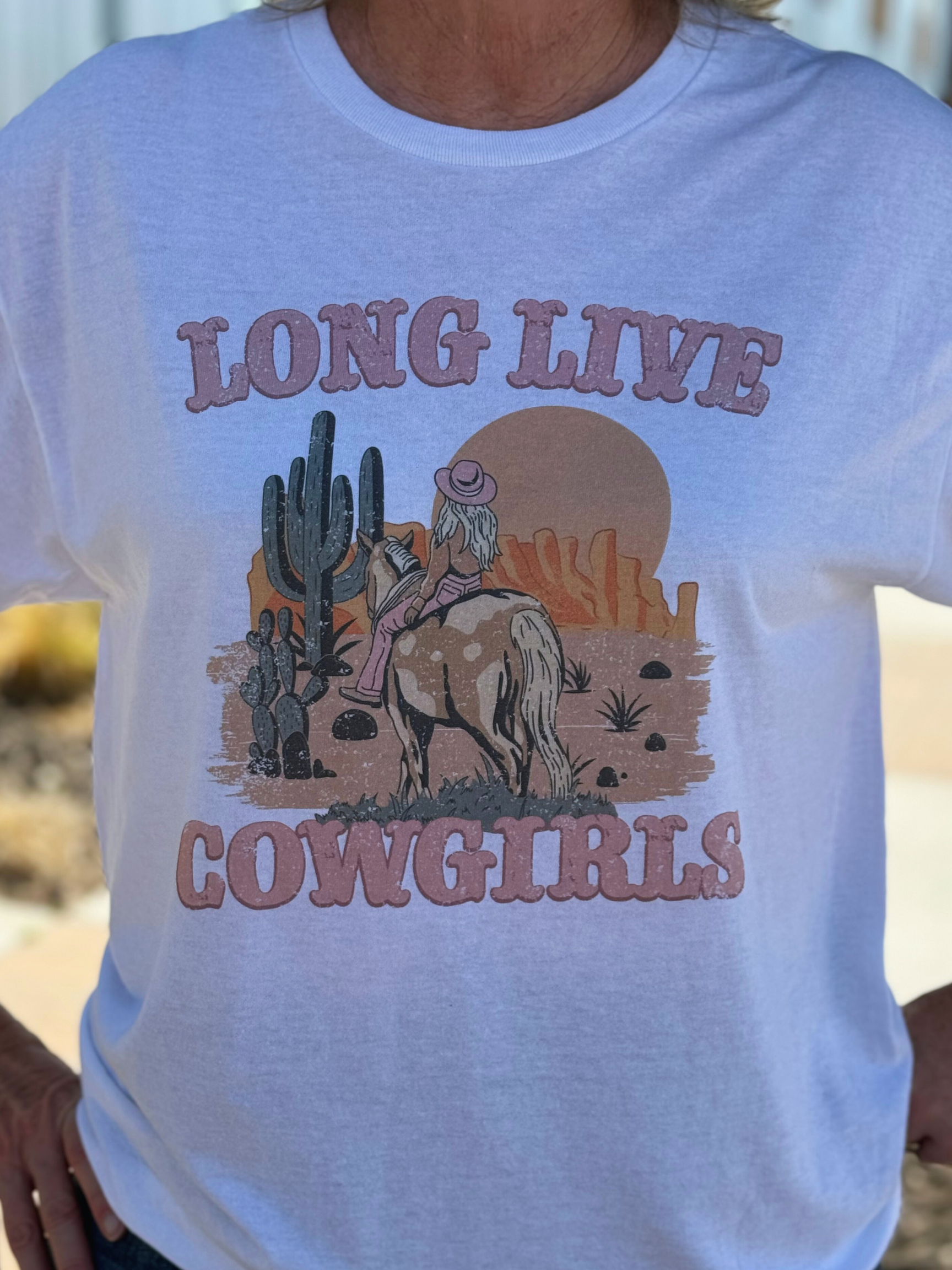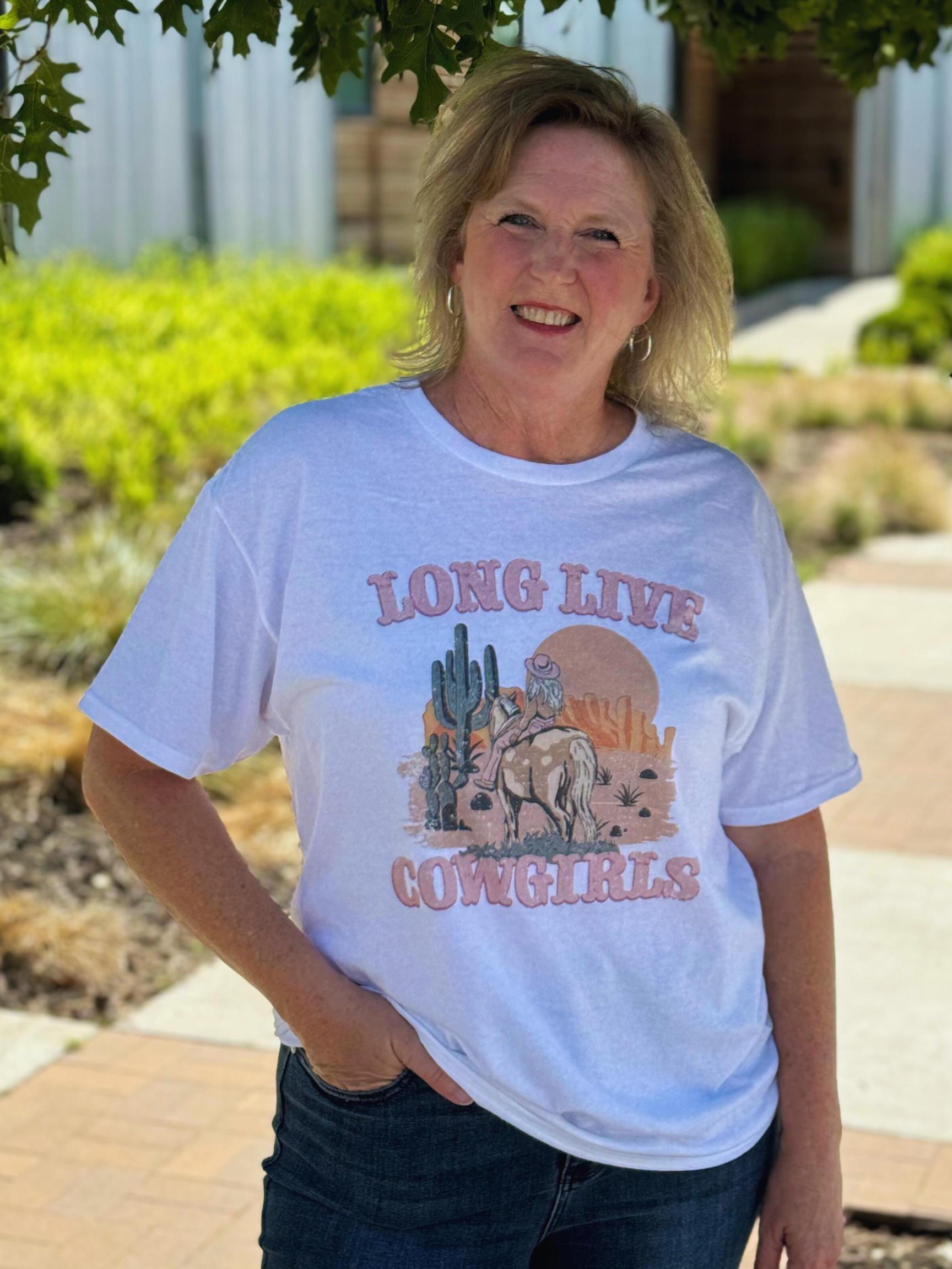 White short sleeve unisex premium cotton t-shirt. Seamless double needle collar. Taped neck and shoulders for durability. Double needle sleeve and bottom hem. Design features a distressed design with a cowgirl and desert scenery.