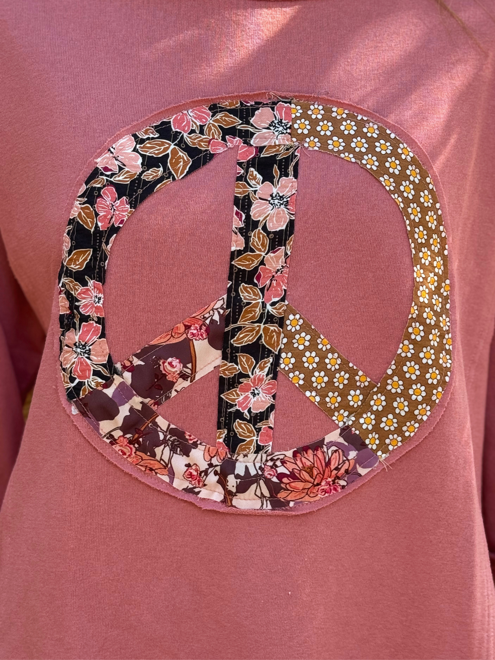 Round neckline, 3/4 sleeves, raw edge detail, peace sign applique patch, dropped shoulder, relaxed and oversized fit
