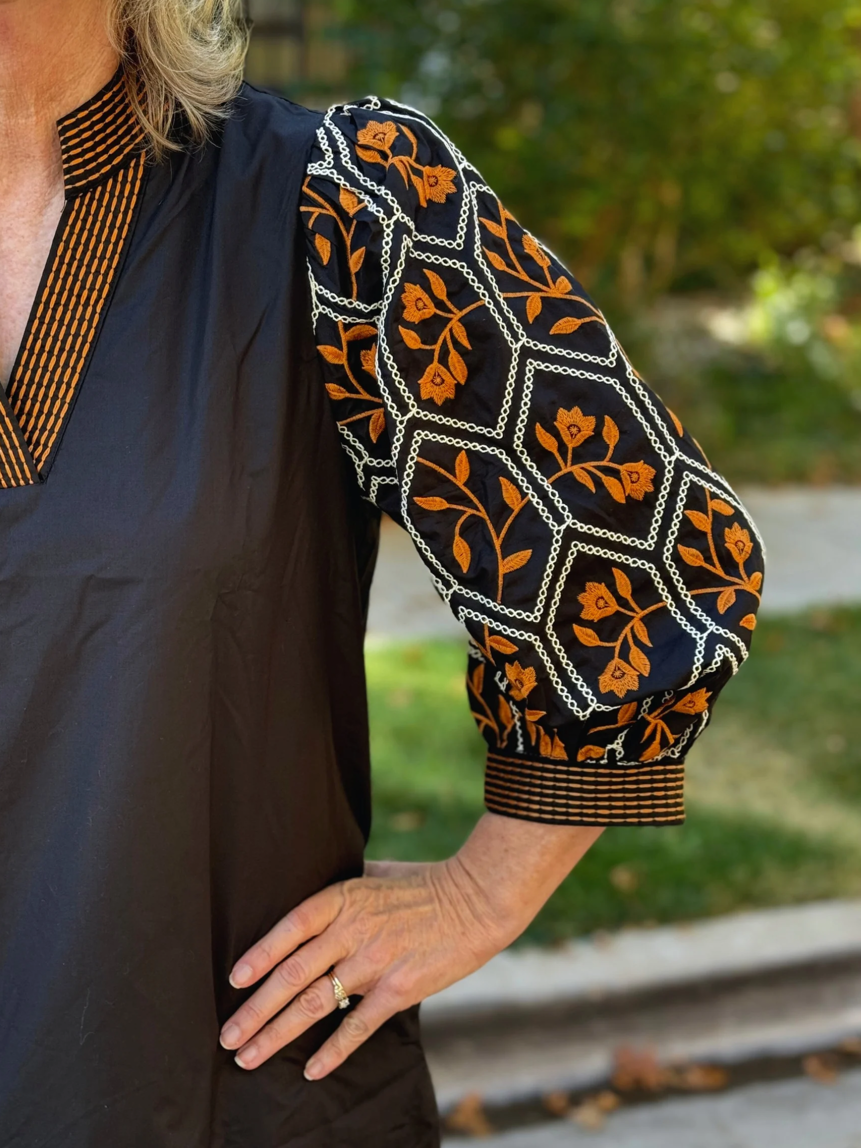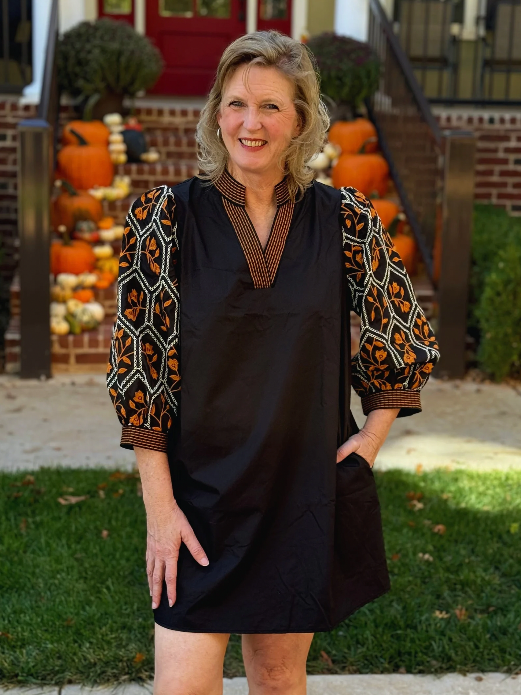 Solid 3/4 sleeve mini dress featuring textured jacquard sleeve with contrast knit neck and cuffs. Stitch detail at collar and sleeve opening. Side pockets. Lined. Woven. Non-sheer. Lightweight.