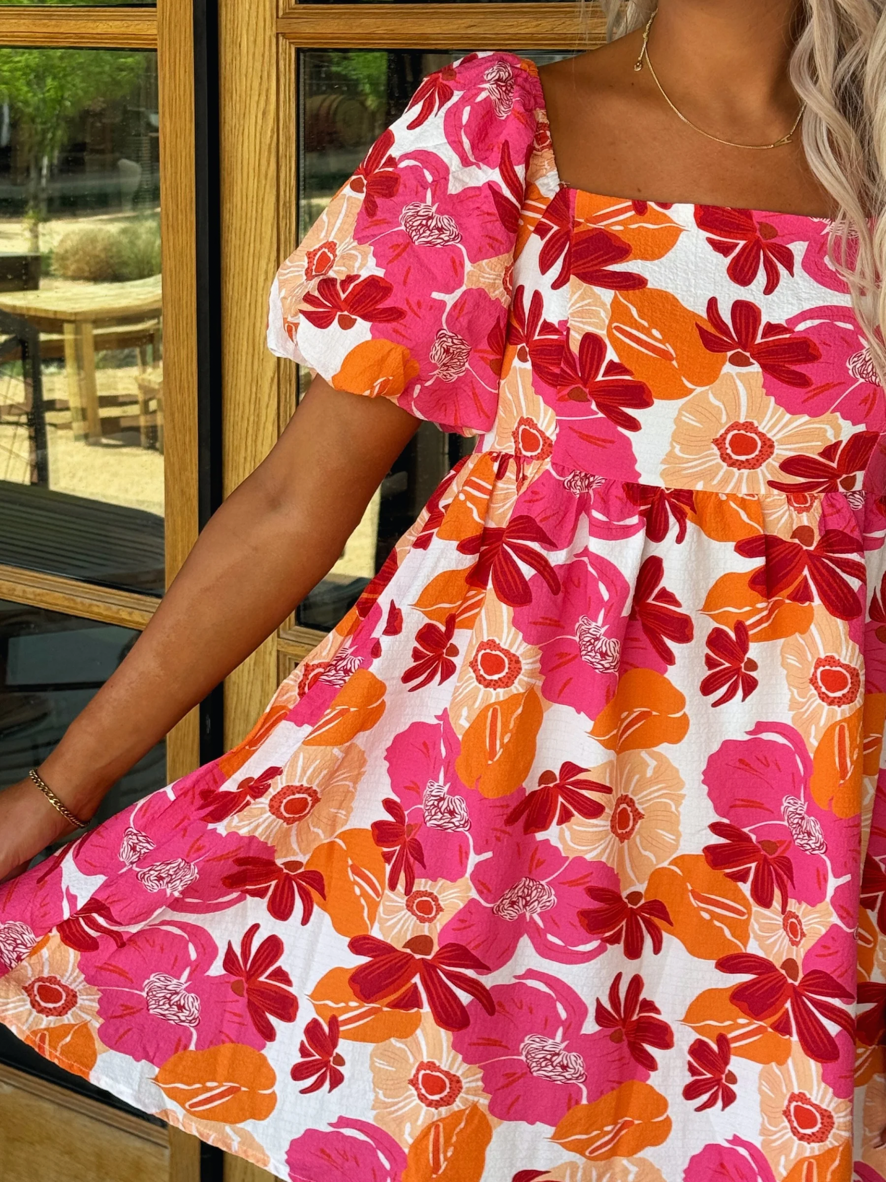 Back Invisible Zipper Floral Print Puff Sleeves Dress
