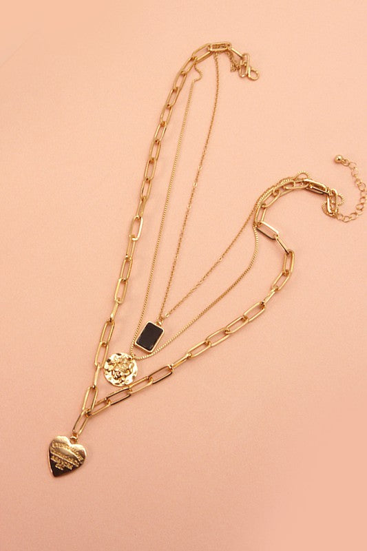 This elegant multi layer necklace has pendant on all layer. This set features a sturdy, yet delicate heart pendant on a slender link chain and a simple chain with coin pendant and epoxy simple black charm.