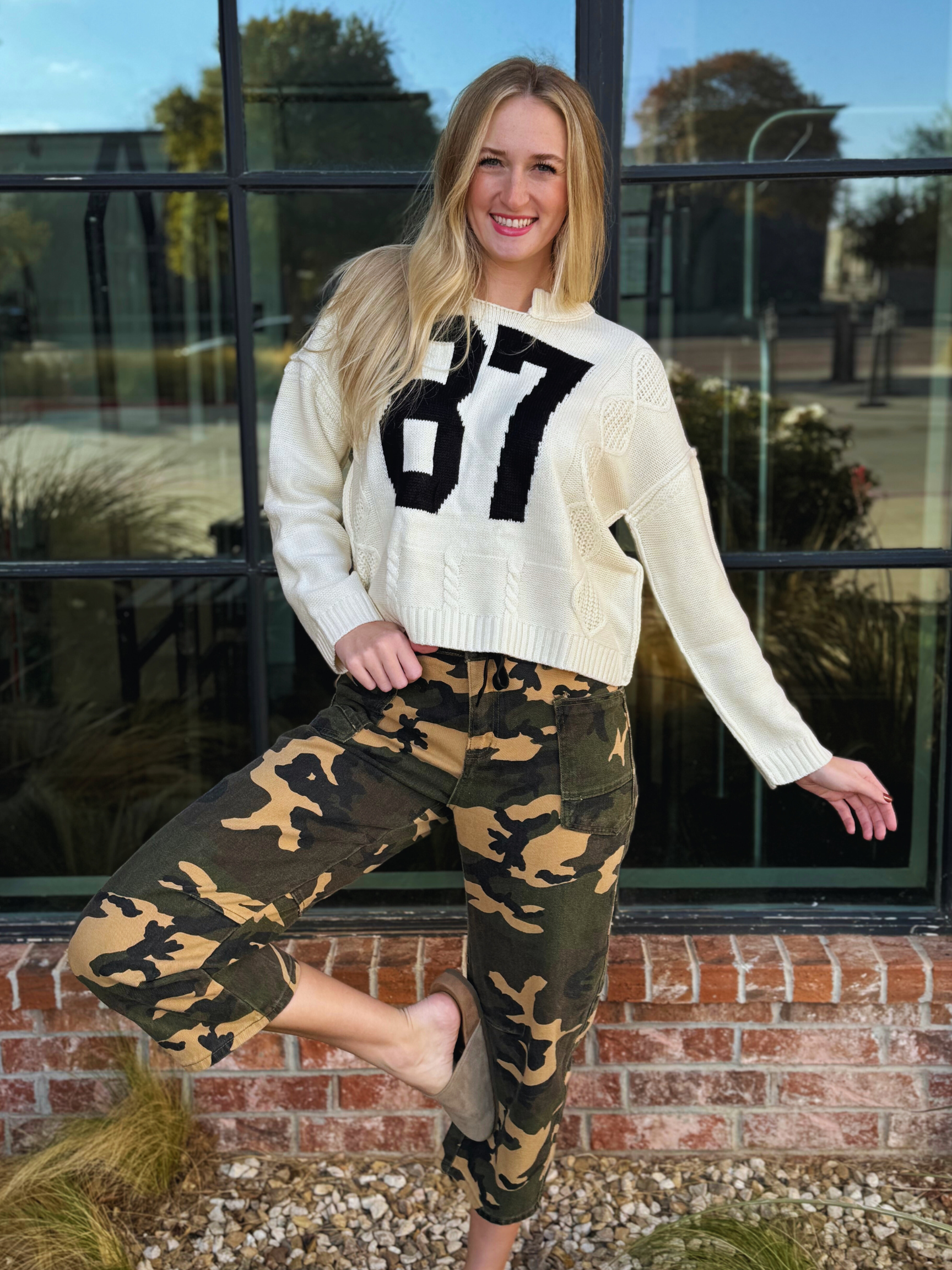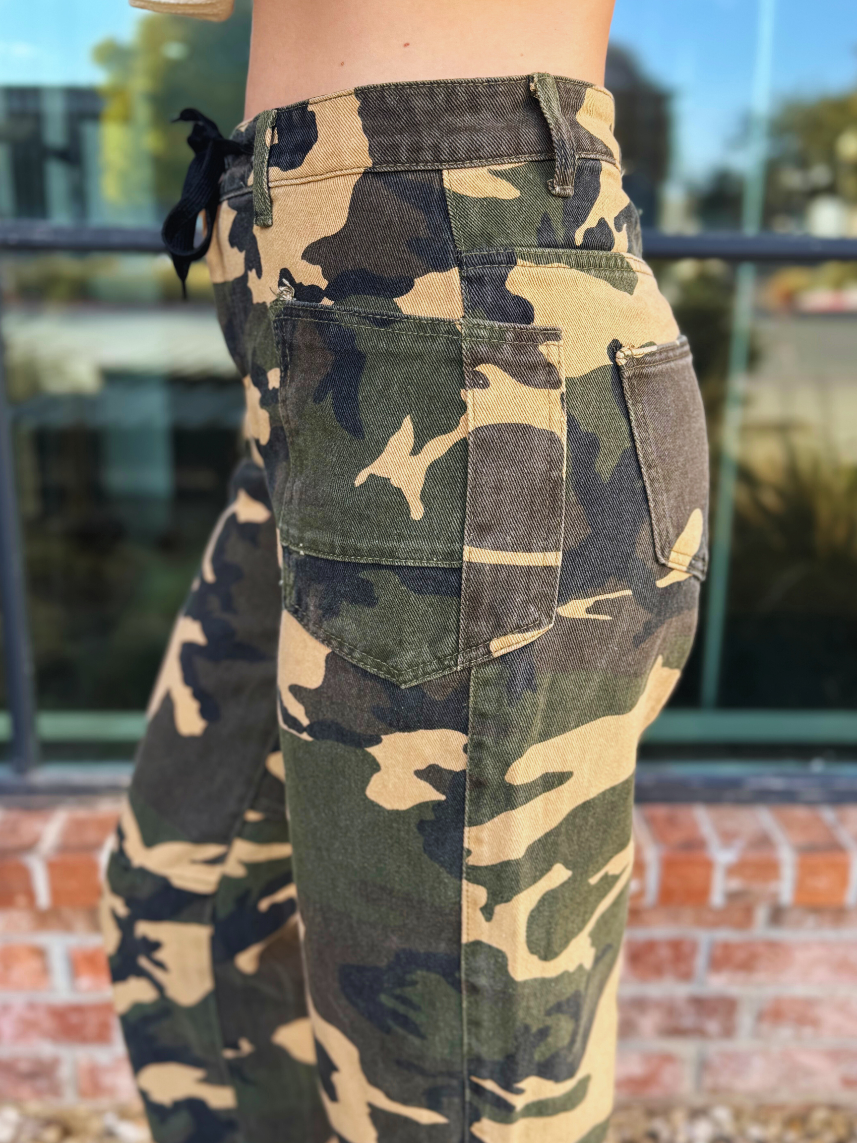 Mid Rise Button Waist Eyelet with Twill Tape Wide Leg Baggy Fit Barrel Camouflage Print Washed Twill Jeans with Patch Pocket