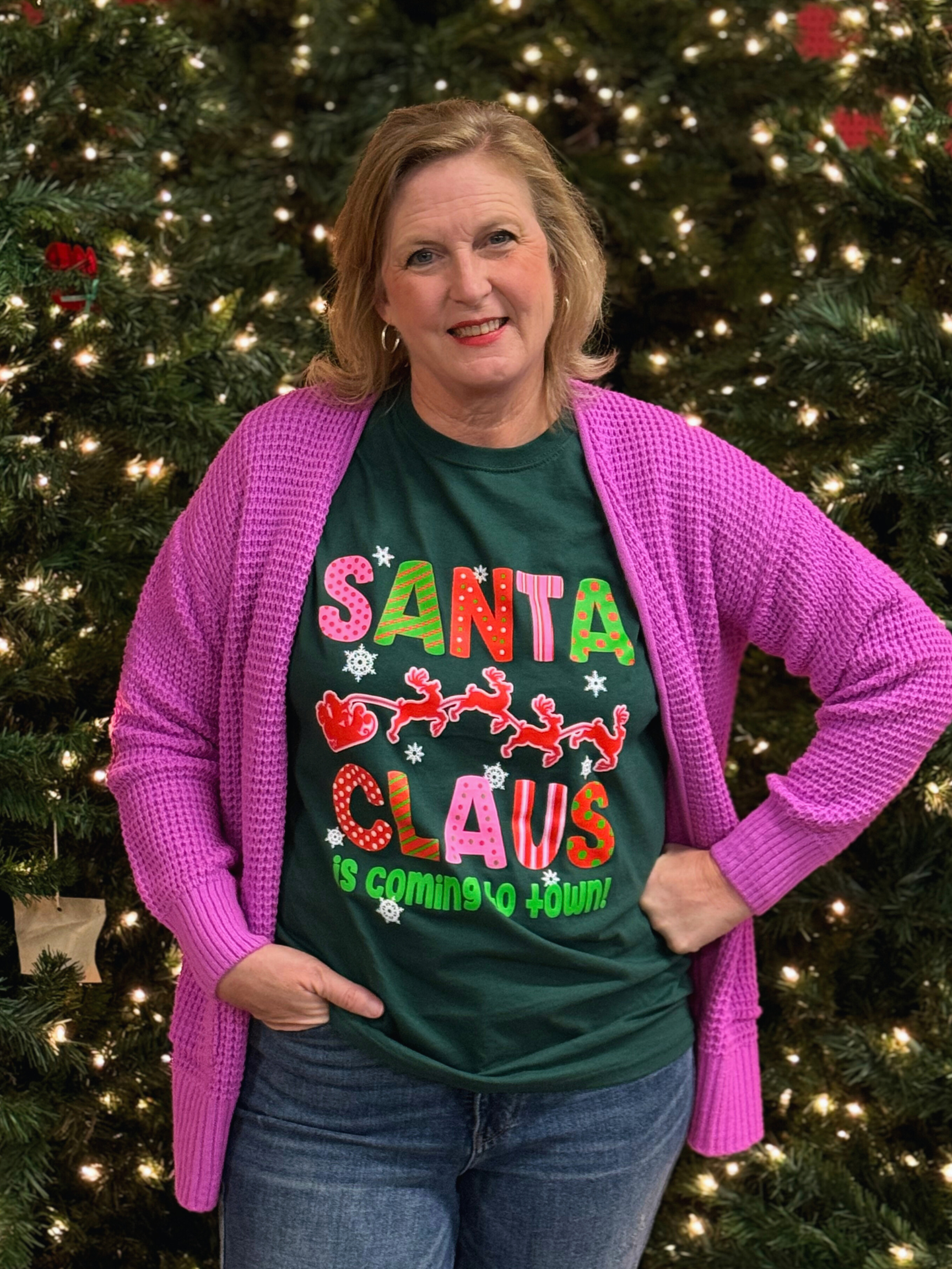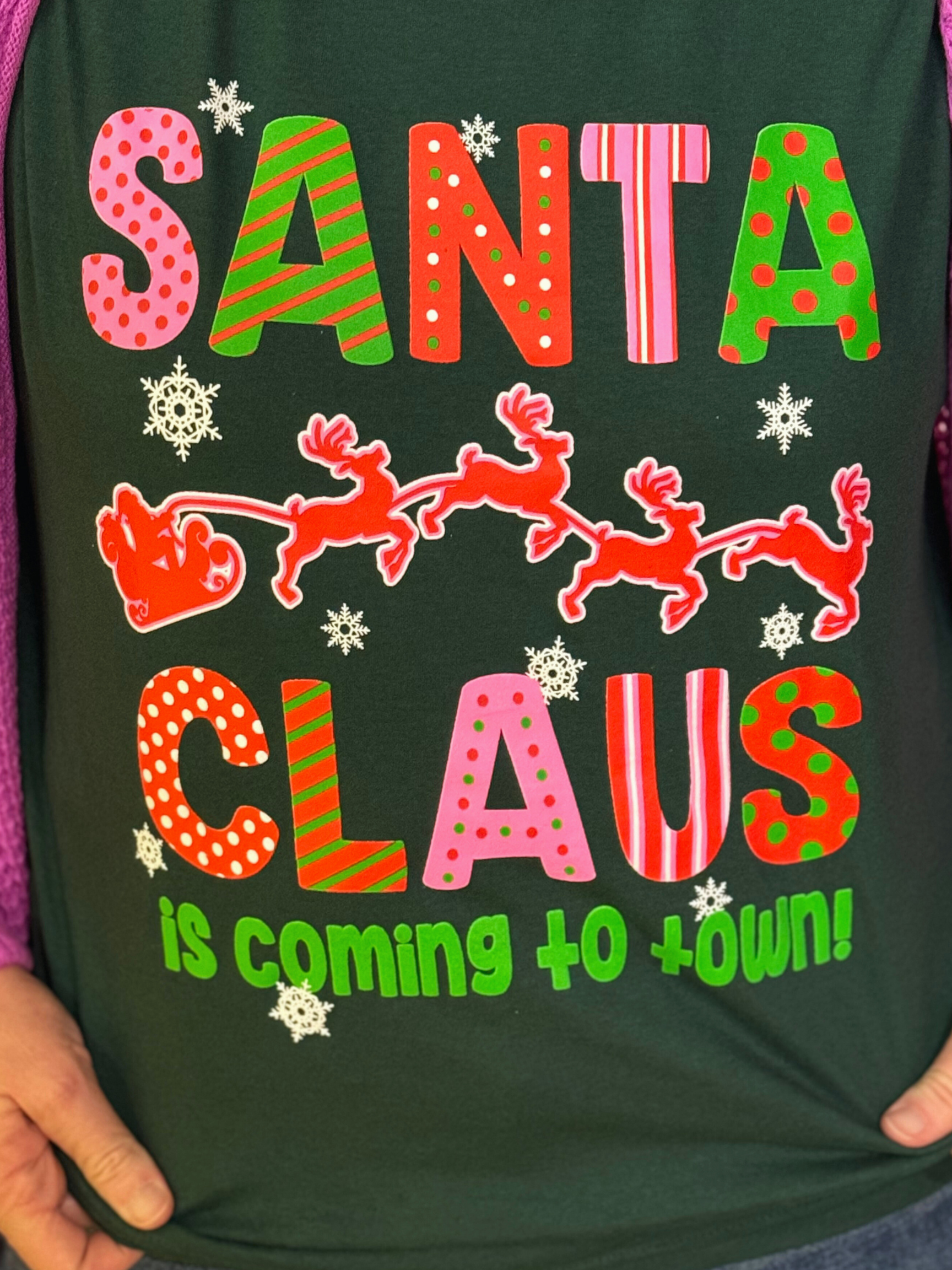 100% cotton forest green graphic t-shirt. This graphic t-shirt's design features the words, "Santa Claus is Coming to Town," in a variety of Christmas-y patterns, with Santa's sleigh and reindeer flying through the middle. This top is perfect for Christmas season!