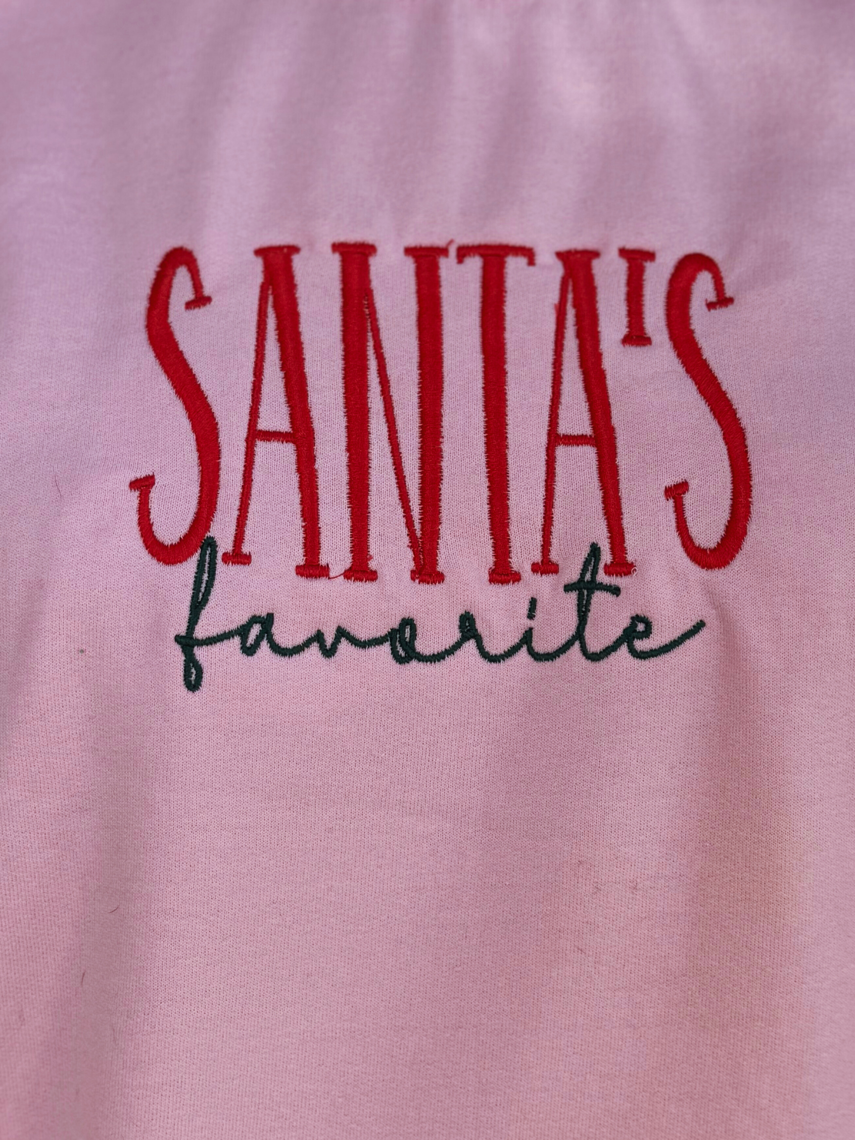'Santa's Favorite' embroidered on a pink sweatshirt.