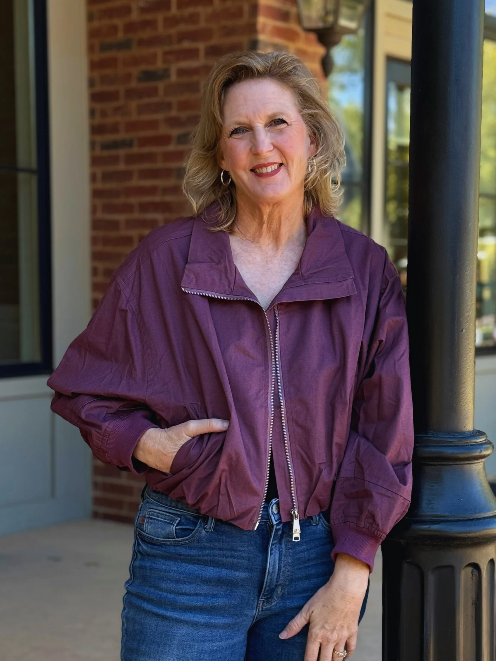 Mock Neck Zip Up Jacket with a Gathered Hem and Ribbed Cuffs
