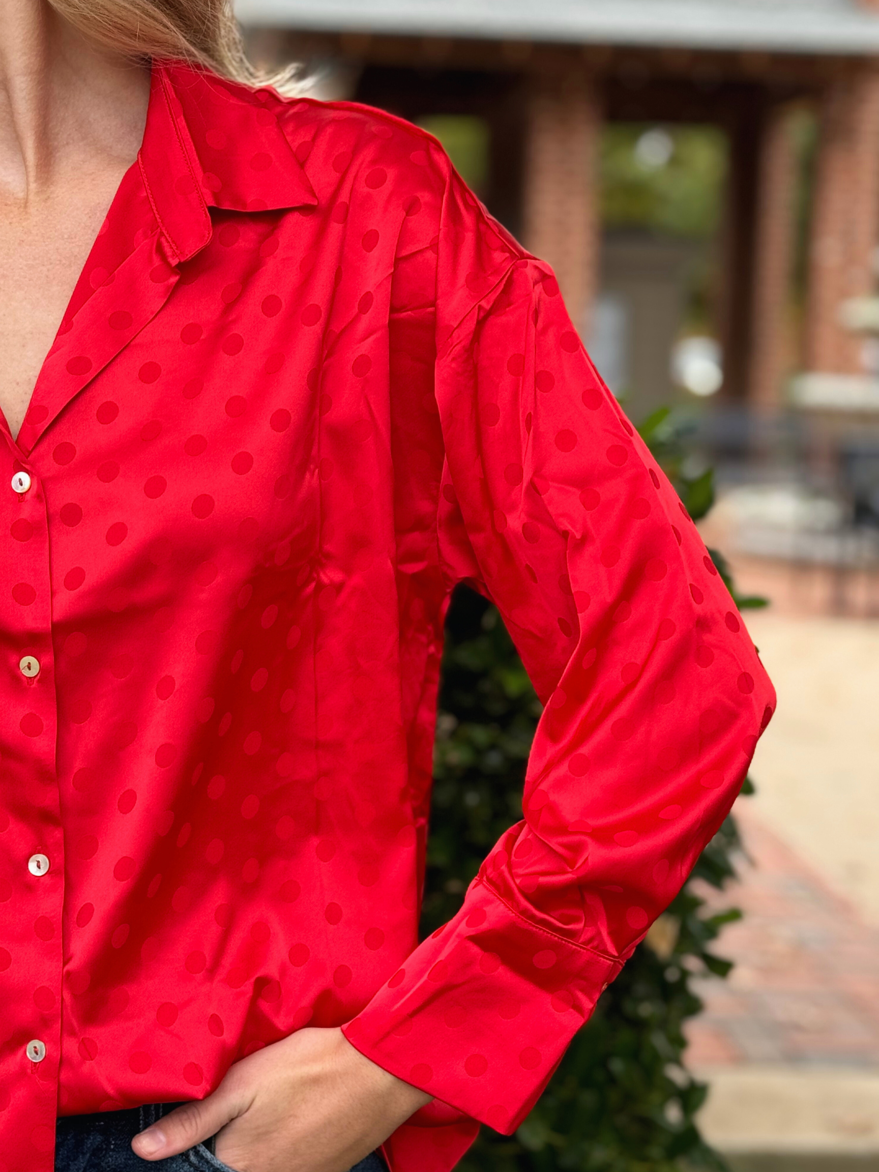 Long Sleeve Dot Printed Satin Blouse Top